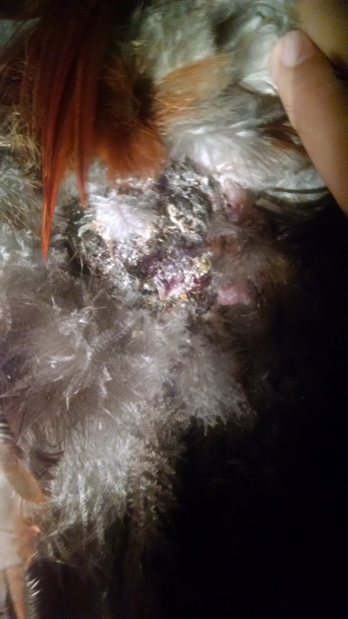 I have an areacana rooster. he in the same pen with another rooster. There aracana tail feathers have been messed. So today i looked and SAW HUGE SCAB THE SIZE OF A BASEBALL !!!!!!!!!! I dont know what to do he does peck at it but i dont think is from the other rooster because they dont fight . He does not roost which i dont think it might be irratated because of the ground IDK I HELP NEED