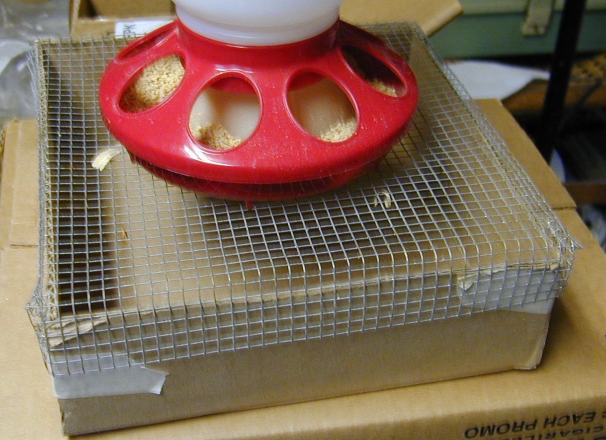 Great idea of the mesh covered box--I'm currently using a large (32"x20") tote for my brooder--not sure if I can find a box big enough to sit under the feeder and still have room for my chicks to run around...