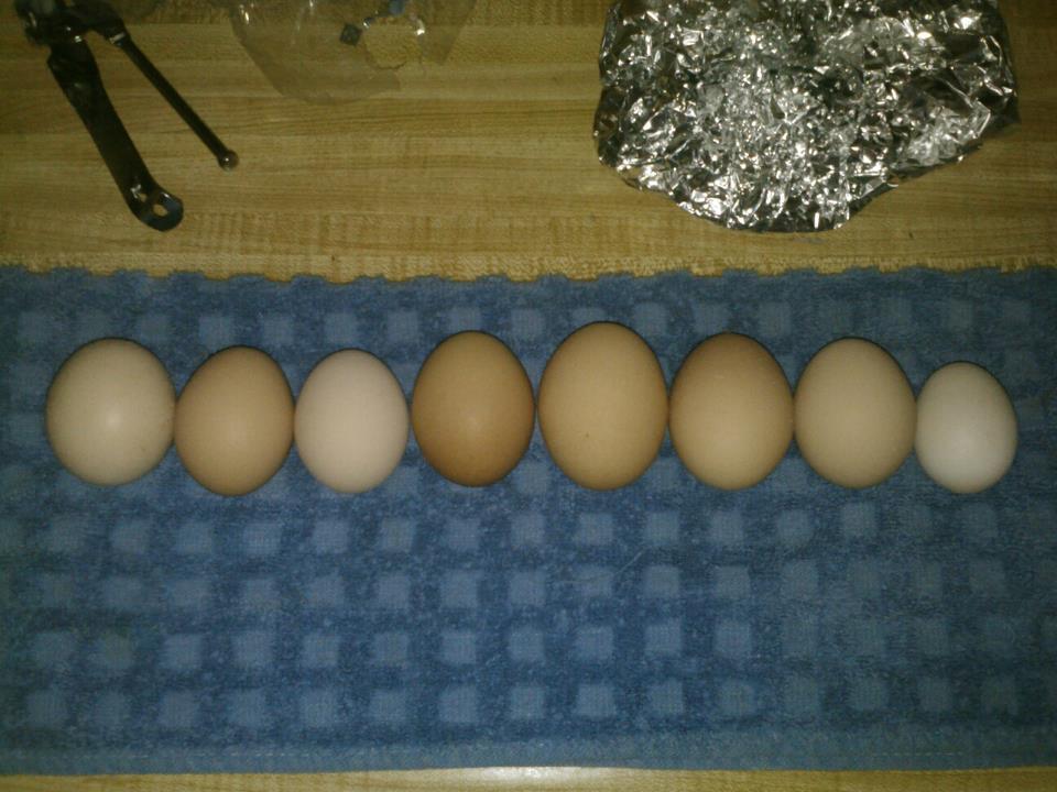 I get about 3-6 eggs a day from 6 hens. Today so far 5. I have 4 dozen eggs in the fridge (had more, but made a yummy cheesecake last night). How much do NN eggs go for (hatchin)? Does it make a difference in price since they are crossed with an EE?