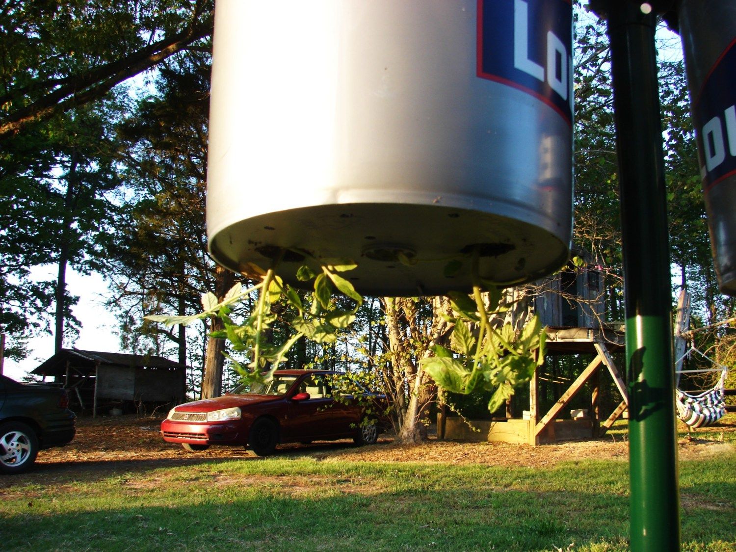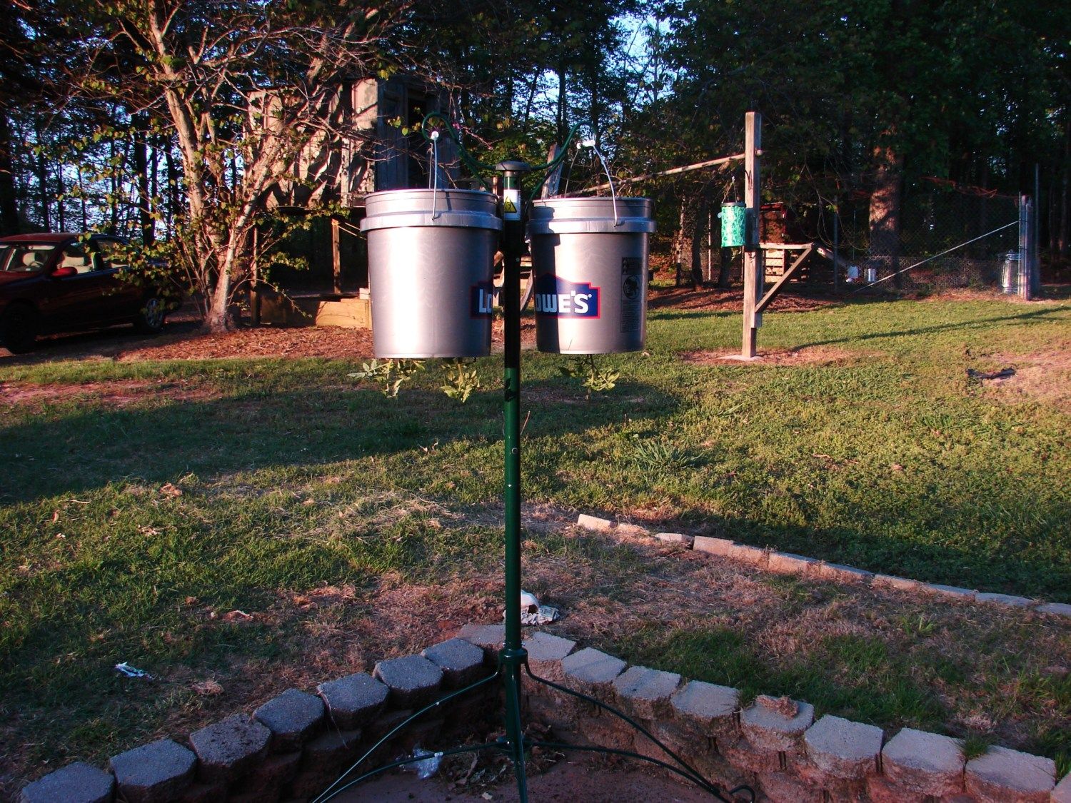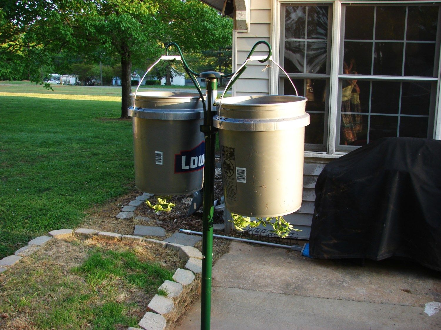 We finally got our tomato plants put up today - we use upside-down planters because for some reason, everything I plant in the ground dies. We couldn't find all of our planters, though. I'm guessing we may have left them behind when we moved last year. Instead of buying more (because I'm completely cheap), we made some out of some buckets we had. Turned out pretty good...and I'm excited to see how the tomato plants do this year.