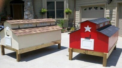 these are the coops i just built for my chickens when it's time to leave the brooder. (2 week olds) i'm gonna build a run between two of them. the sides lift up for easy access to the eggs/cleaning and they are waterproof when closed. vinyl floor, nesting boxes, and roosting bar inside. i'm coop crazy!!! i actually built three because i love to build them.