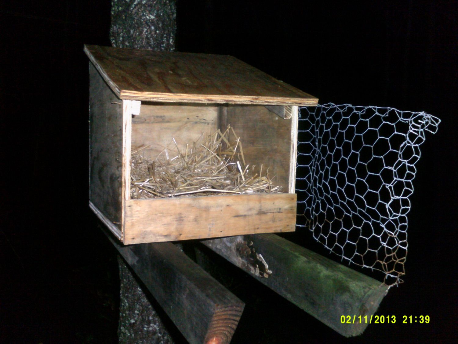 We moved the happy little couple into a nesting box that is attached to a tree tonight. It is wired closed for the night, and we will turn them loose in the morning to see if they will use it. If they don't right away, we may try to do the over night placement a few more nights to see if it can be taught, but that depends on where they do perch tomorrow night.