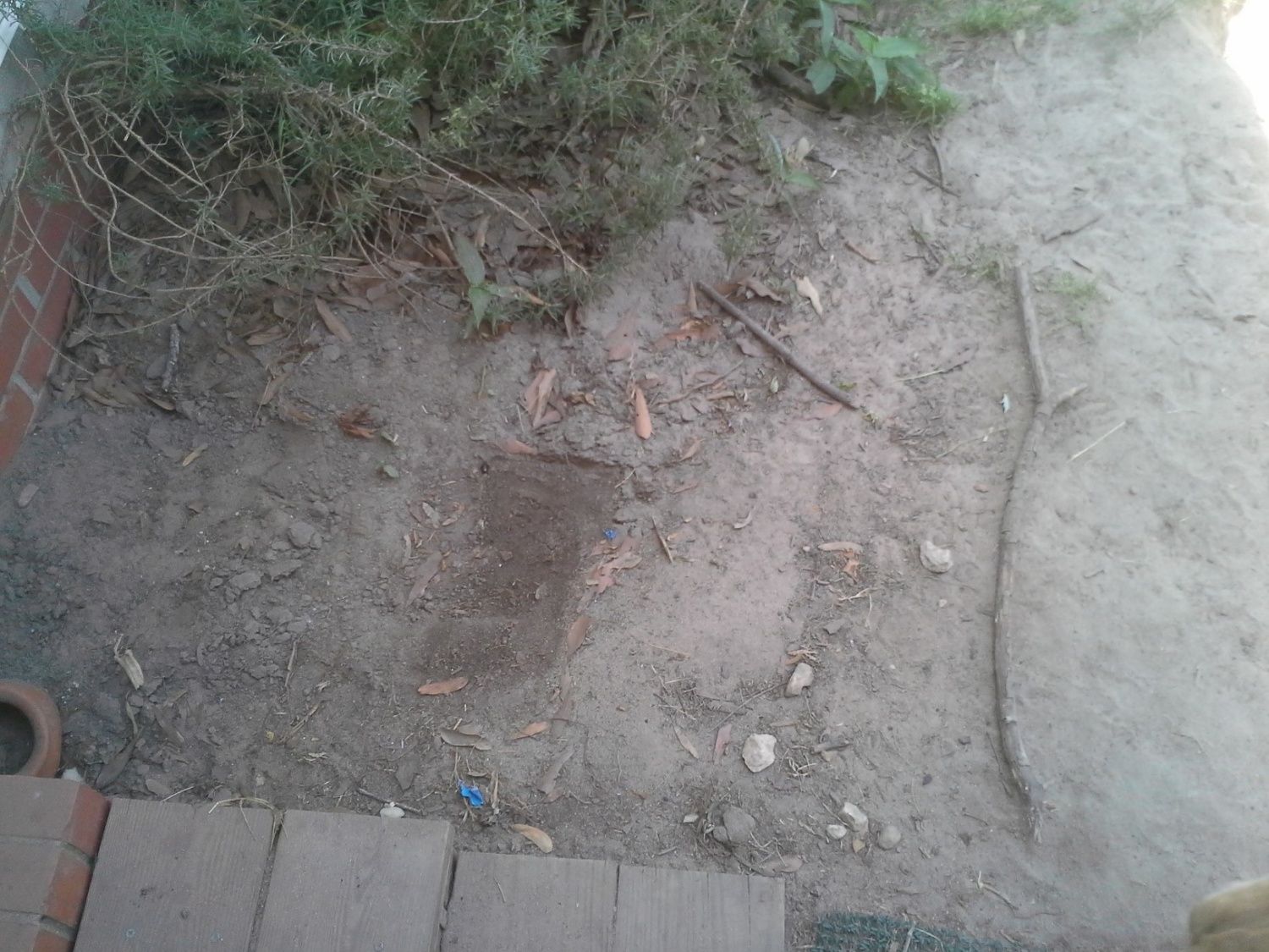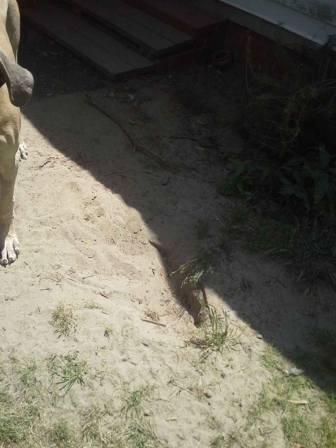 We'll not quite. But after my menfolk left, I walked out of the house and tripped on a hole the dogs dug. Again. Took me nearly half an hour to get back to my feet, and by then, I was mad. I keep asking hubby to do something permanent with the holes the dogs dig outside the back door. Every single one has dug there as a puppy. Murphy is five years old, so that's how long this has been going on. Hubby simply gets another load of dirt and fills in the holes. Day after day after day. DS filled them in three days in a row while he was here before he quit. So the back door area looked like this, this morning: