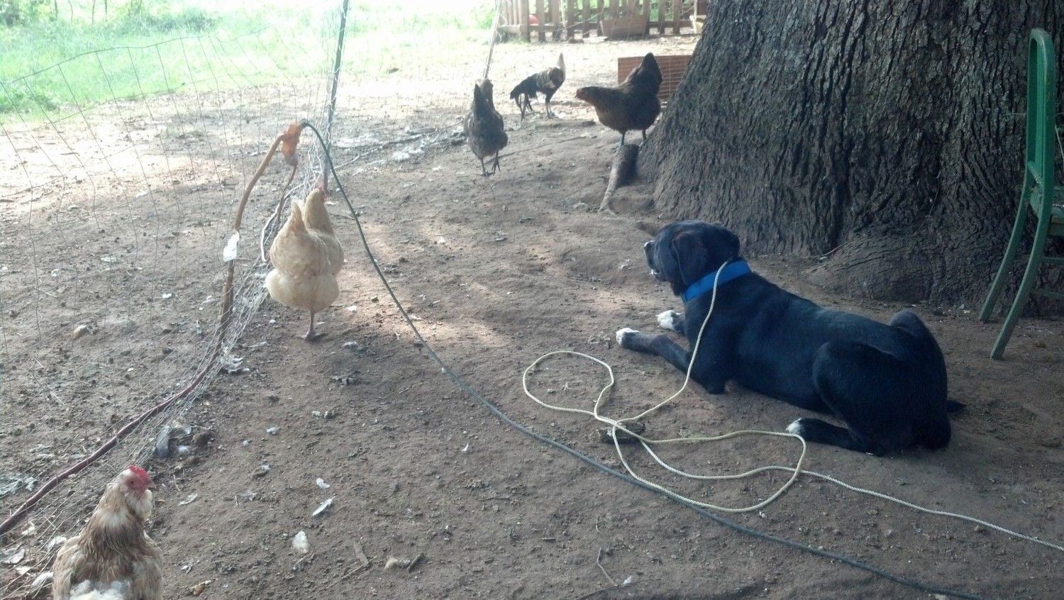 "Me? Nooo...I'm not thinking about chasing the chickens! Nope...not at all! OK,
