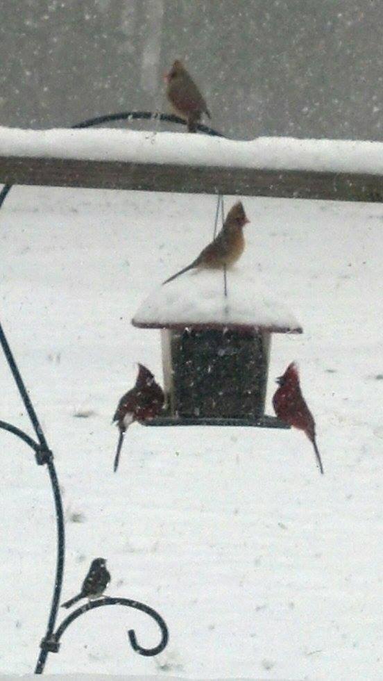 Looks like we got 5" today before it started to freezing rain on us. I'd be loving the view a lot more if hubby wasn't stuck trying to drive through Raleigh in it. :/ He left early this morning for work, but no flights leaving RDU for JFK because of the weather. He's trying to make it to his cousins house in Cary, but between the roads and the other drivers (personally think those are scarier than the ice/snow) and all the accidents...