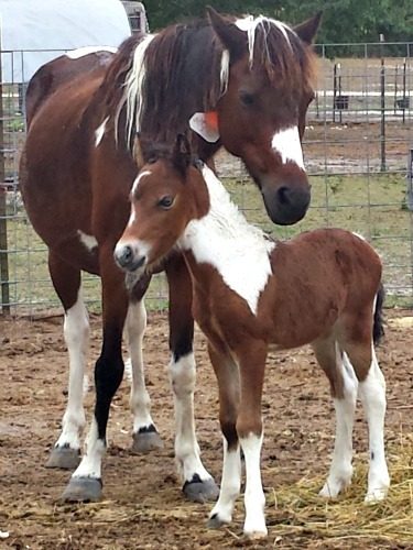 and a picture of Riddler (see the backwards ? mark on his forehead? - My Marvel Comics family named him) with his dam (mom) at 2 days of age with the Roo tractor in the background and a pic of a friend when she saw Riddler for the first time (comparison on pony sizes) this time with the Pullet tractor behind them.