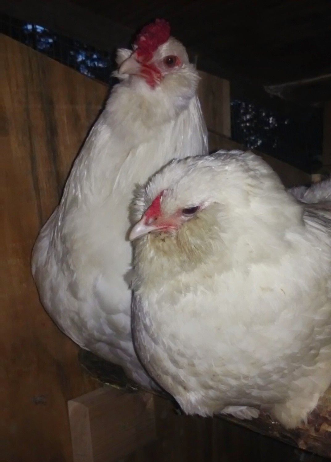 Here are my two favorite birds (white Ameraucanas): Pearl & King Rooster