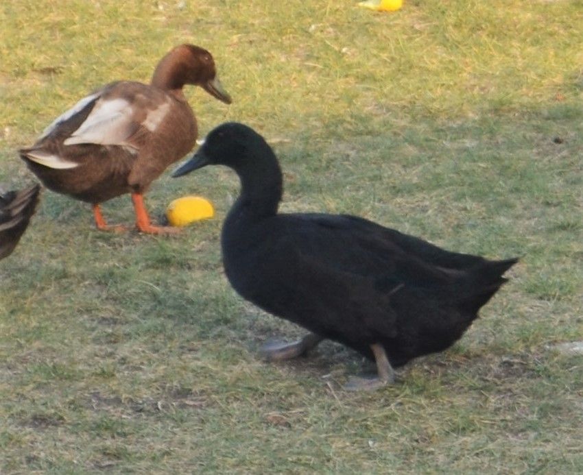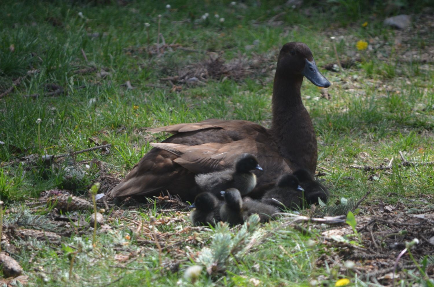 Here's the Khaki mom with the babies a month ago. And the Cayuga female who's broody.