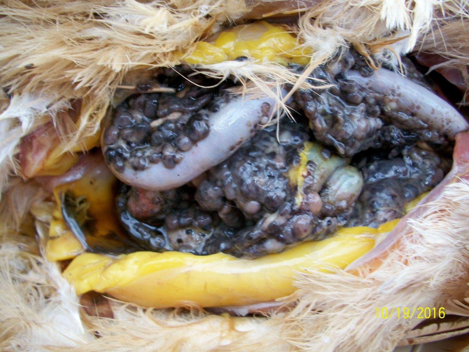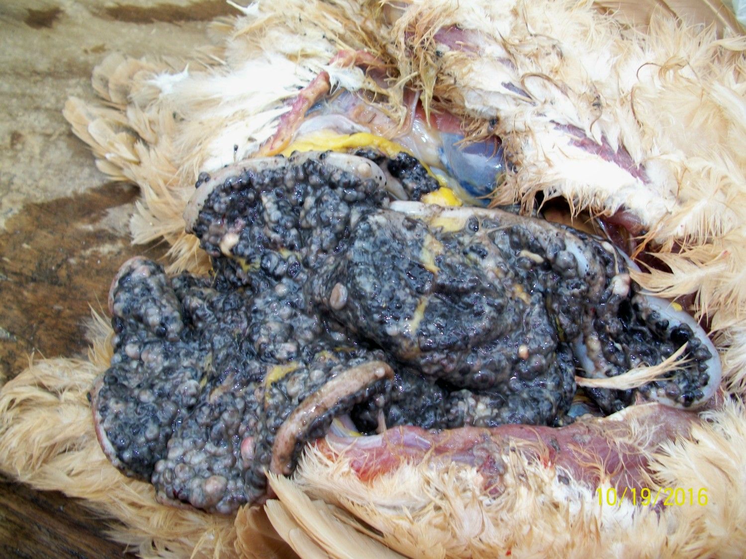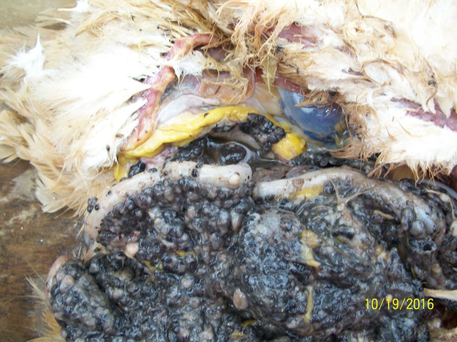 Interesting color... I've seen that before, but not black like that. Hard to say what type of cancer it is without testing. -KathyThis seems like a likely place to post a pic and ask you guys if it looks a little familiar. This is a bird given to me by my sister(along with 16 others), who has had many birds die over the years from a range of symptoms, the most recent had a large tumor in her throat...that bird was 12 yrs old. This bird had massive ascites, yellow liquid diarrhea and dark brown fluid coming out of her mouth when she arrived. She died the next day. Does this look like lymphoid leukosis to you? These tumors covered all surfaces in her abdominal cavity, her liver was pale and yellow, the heart appeared normal, the lungs were dark red, there were larger dark red tumors in her oviduct and her ovary looked like the black tumors you see here.![]()