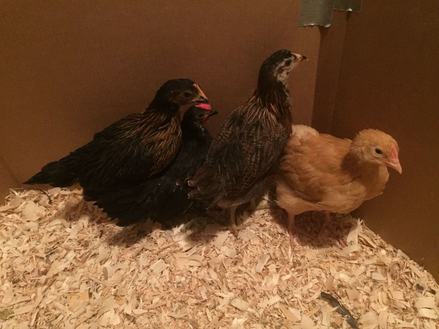 I took home 4 breeds from the local feed store - A Barred Rock, Buff Orpington, Americauna and Black Sex Link. I think the one I suspect is a cockerel is the sex link. The solid black is the most shy, and often hides in the back of the group. I sure hope I have 4 pullets, but wondered if anyone could tell. They are about 4-5 weeks old.