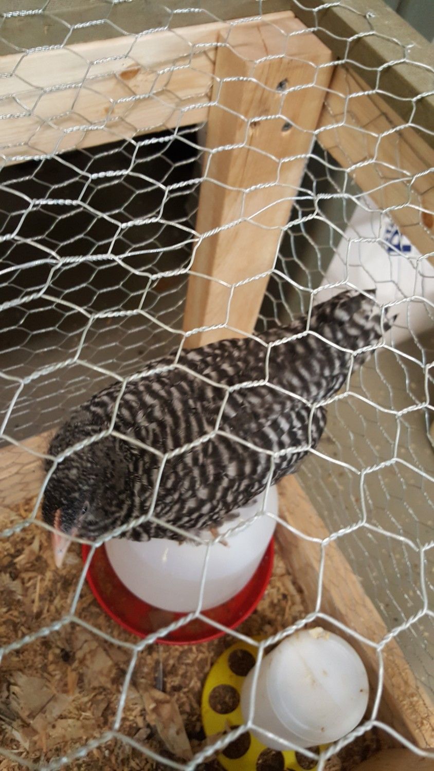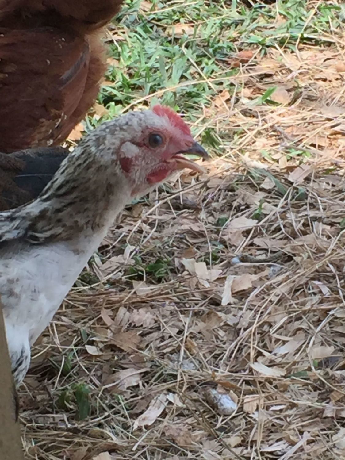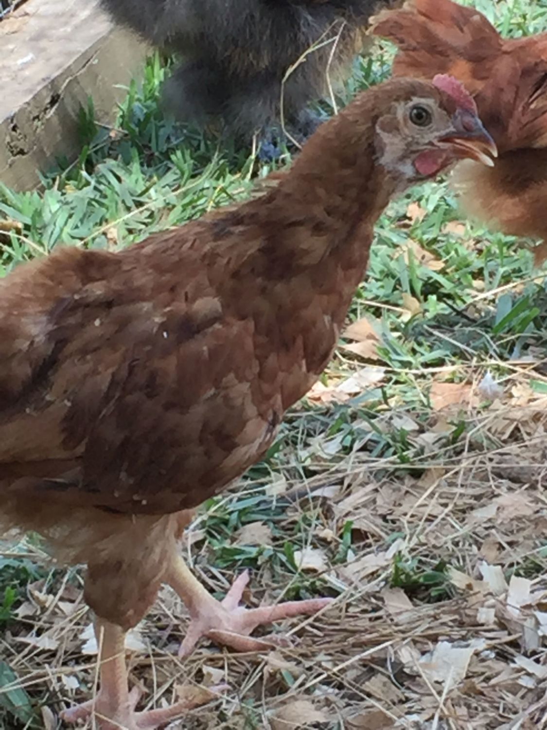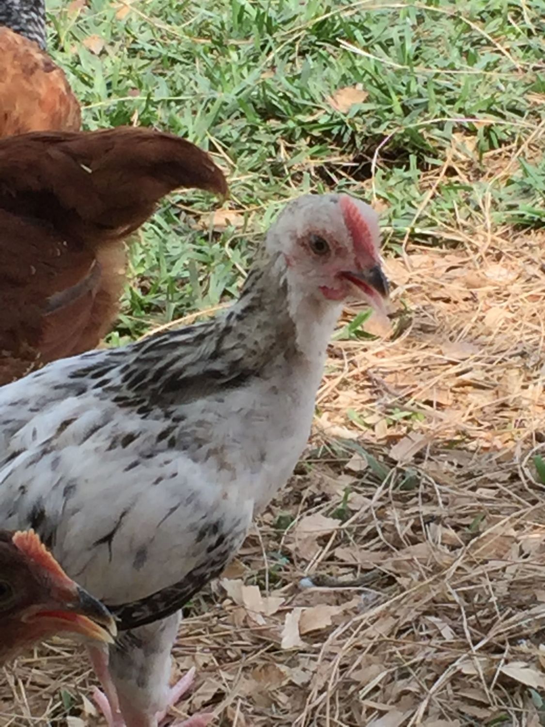 And this one we thought was a pullet but the red wattle just popped out. Also has brownish spots (barring?) on its back that we also just noticed.