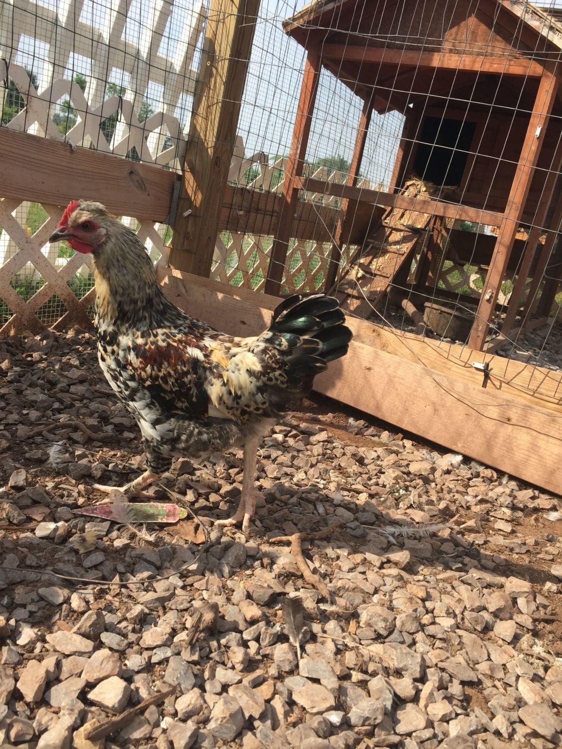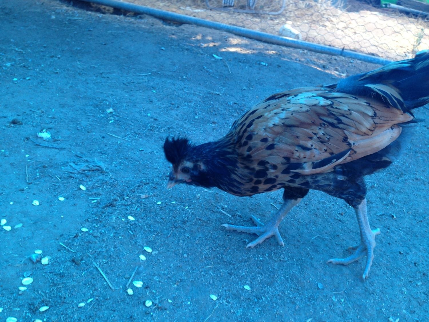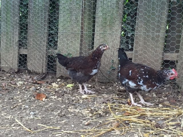 8-week-old speckled sussex. The one on the right in the top picture has already been deemed a rooster on here. But now he's starting to act rooster-y with the one on the left, as they jump up at each other like they want to throw down. So I'm guessing both are roosters. But I've never had a rooster, so maybe they're just playing.