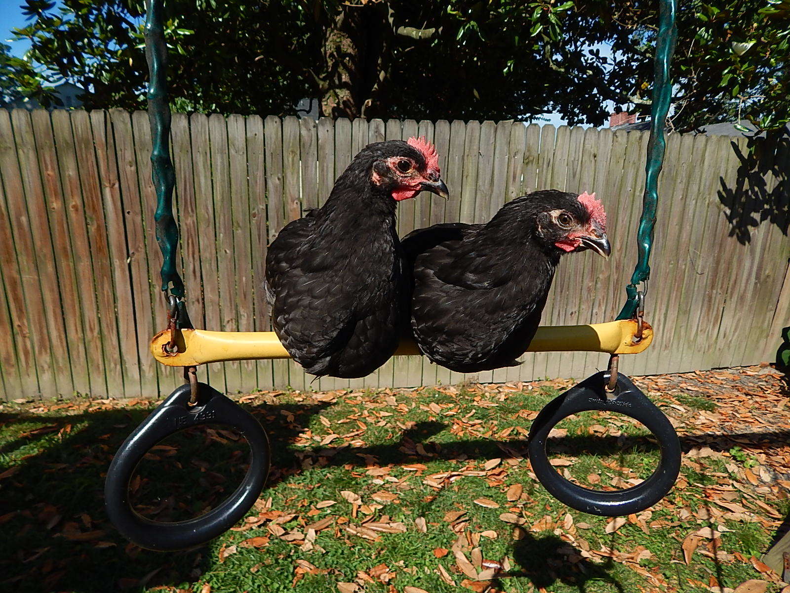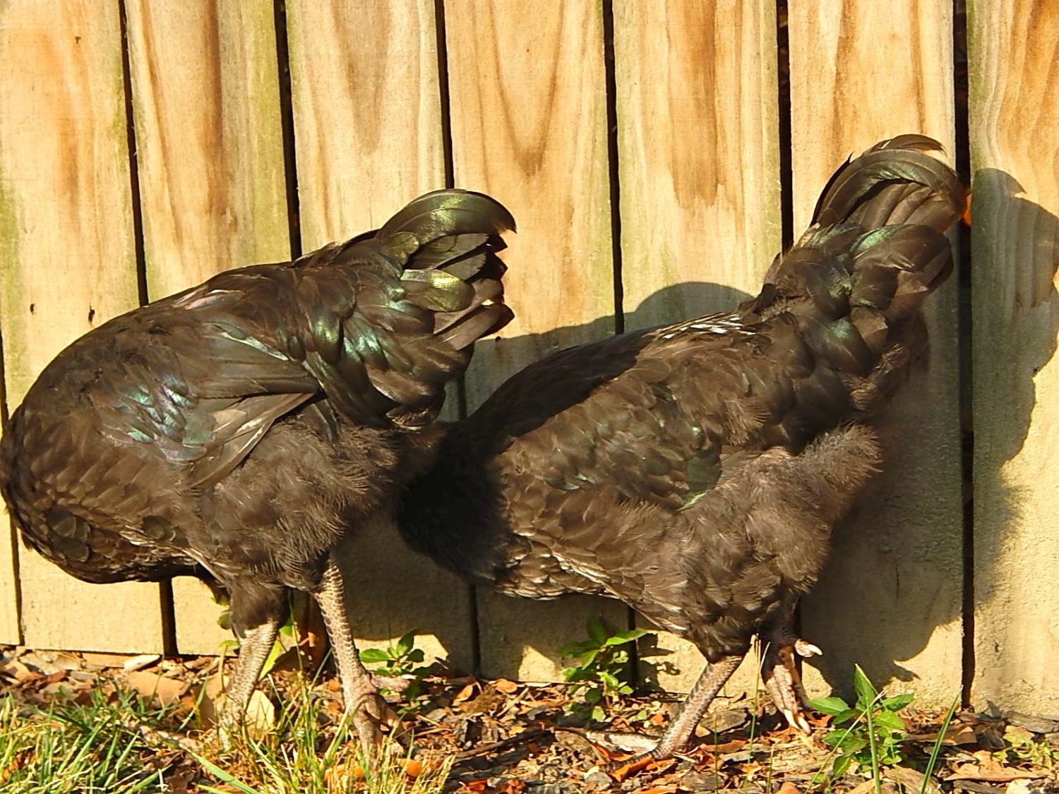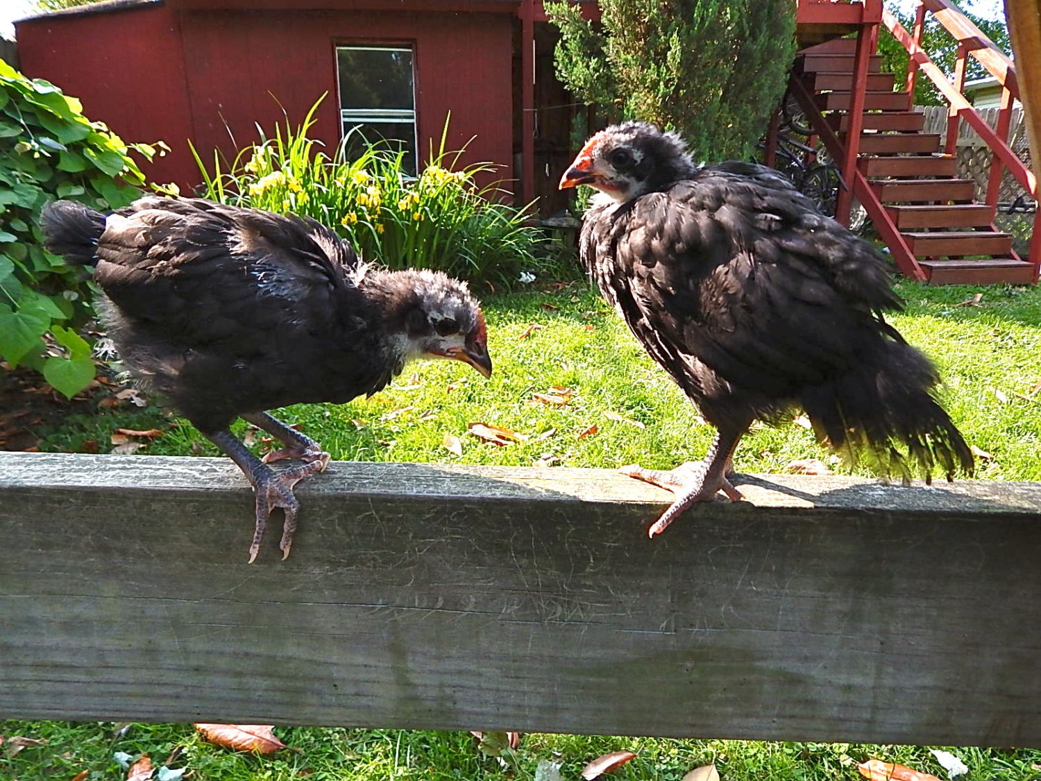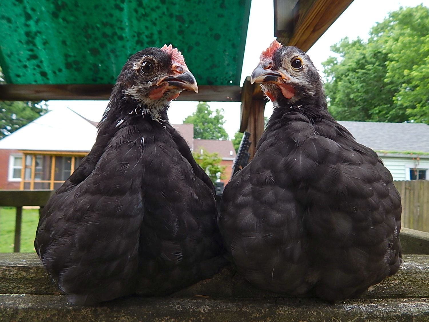 Can you get a closer pic of their backs down by their tail feathers and the back of their necks necks?Hello, We acquired two black Australorp chicks on April 15th. They are sweet birds and have meshed well with our two 5 year old buff Orpington hens. They are 14 weeks old today and one of them has a deeper voice and has made a suspiciously "crowing" like sound twice now. We are not allowed to have roosters where we live. Would anyone mind offering a guess on the gender of one or both of these? Thank you!May 14 Dahlia and Juniper