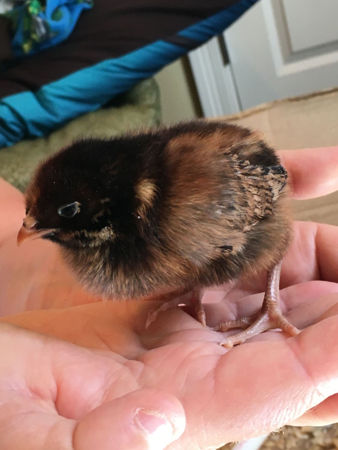 This was the 'surprise' chick with 15 buff laced polish girls. MMcM say they don't put Barred Rock with exotics so..... my completely uneducated guess would be Dominique or Cuckoo Maran. I'd love either, but I'm afraid it's a boy.