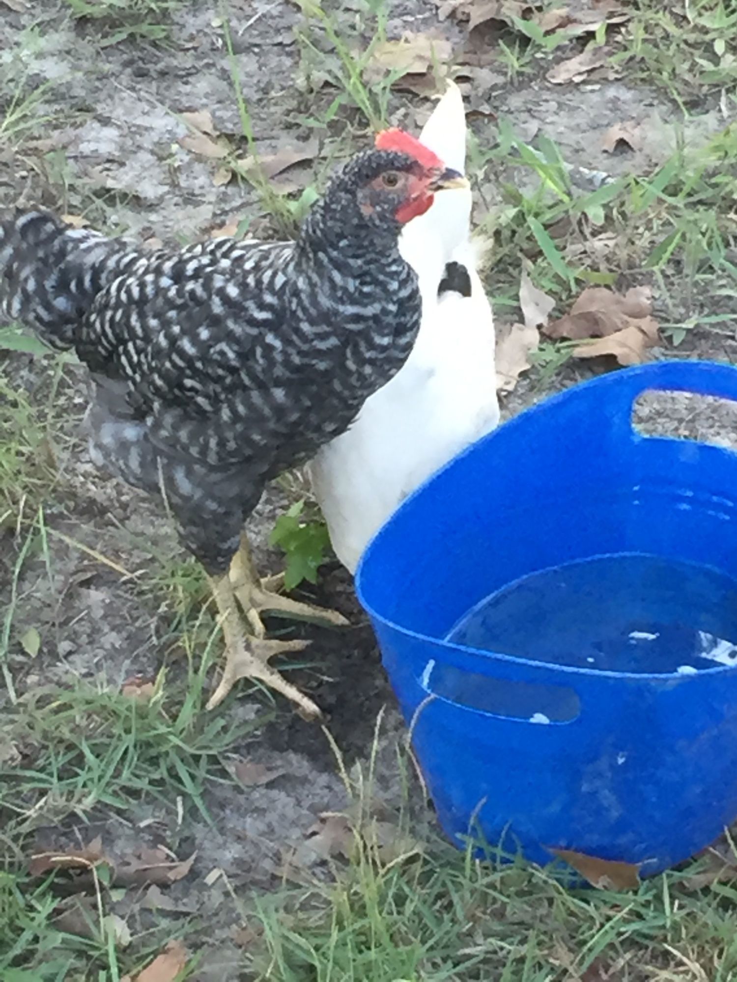Thanks! How long should I wait to put him in? My neighbor gave me 3 babies and one sustained fatal injuries from my girls. The big girls weren't happy about them so the remaining 2 are in a separate cage inside the coop to keep them protected. But they are growing quick and I can't keep them in a smaller cage forever
