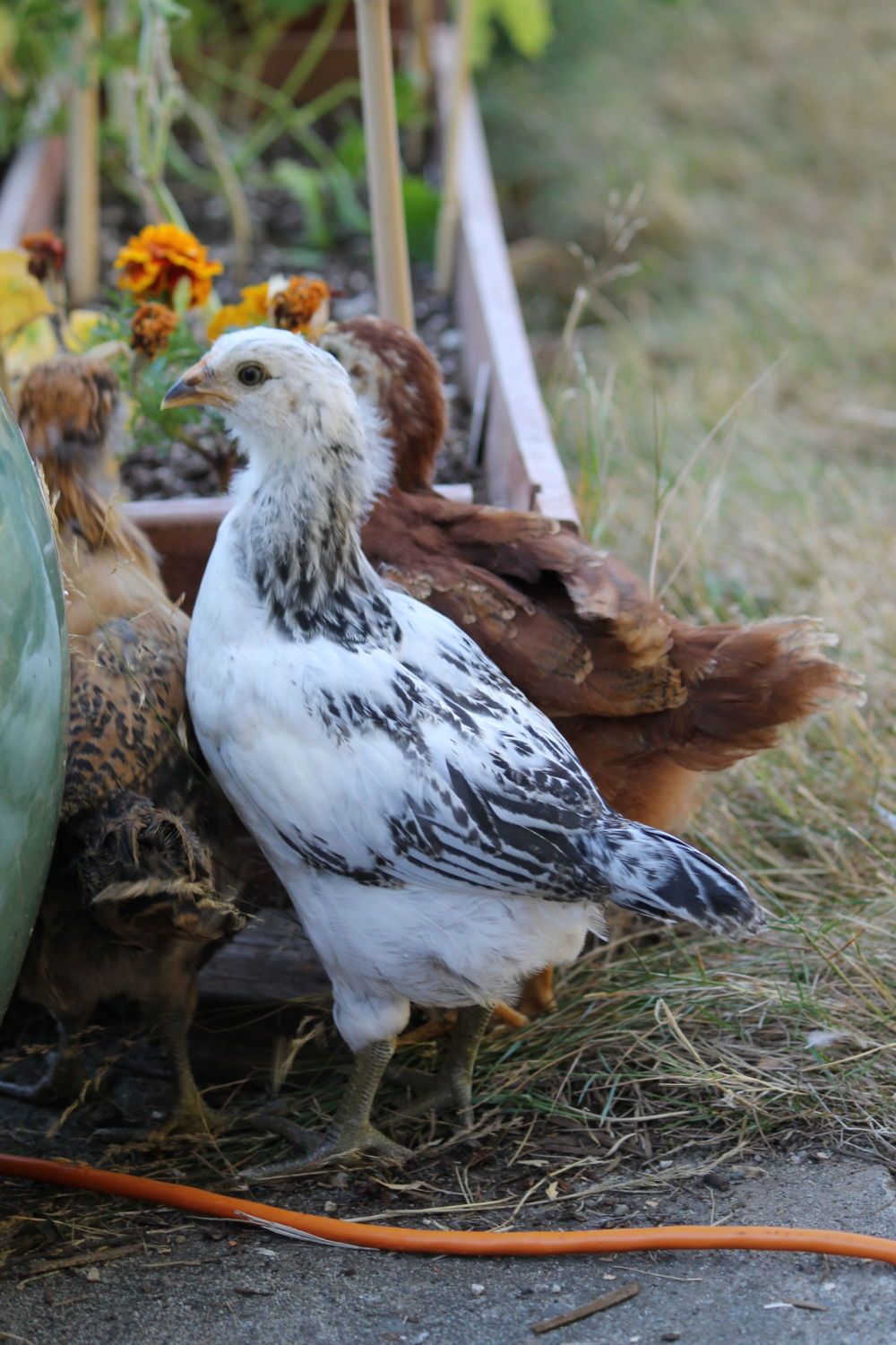 Here's a snapshot of the changes over the last few months. The things that got my attention: color pattern, slower feathering compared to the others, stance, watchfulness of the sky when free-ranging, comb development, tail feathers, raising hackles at and challenging the other chicks.