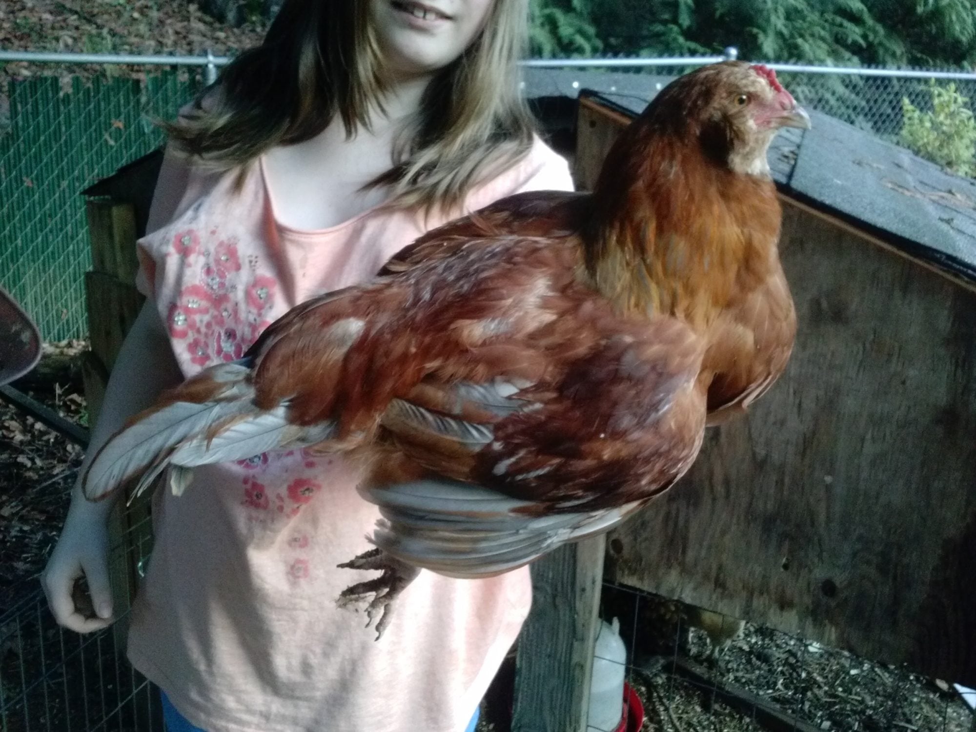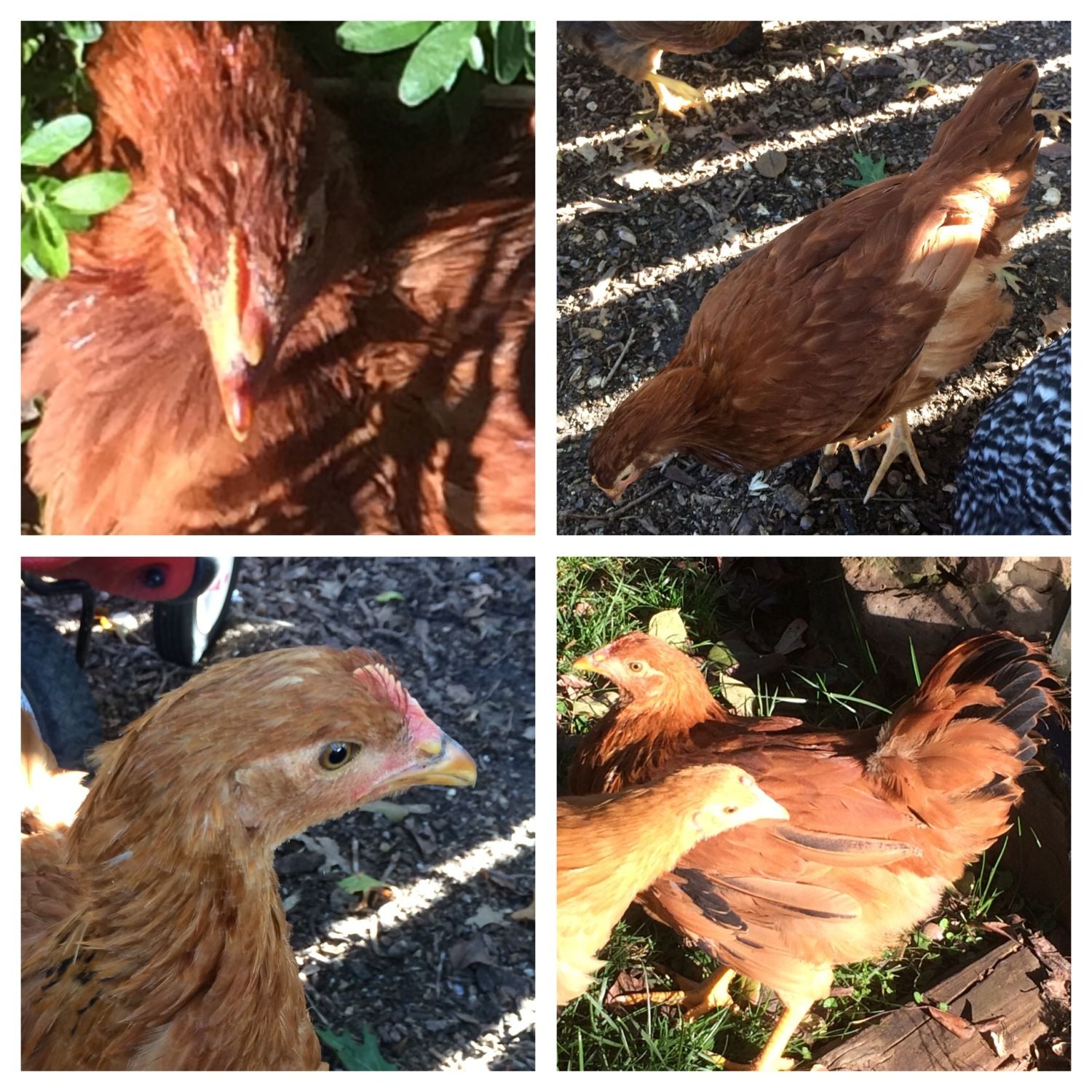 Ok! We're back at 12 weeks old and wow have our chicks grown! I have tried to get front and side views of the same birds side by side for comparison sake. Posting from my phone so can't remember the exact order but we have 2 production reds supposed to be sex links but we think not. Top is Penelope thinking pullet. Bottom is Sassy pants, with suspicious tail feathers....
