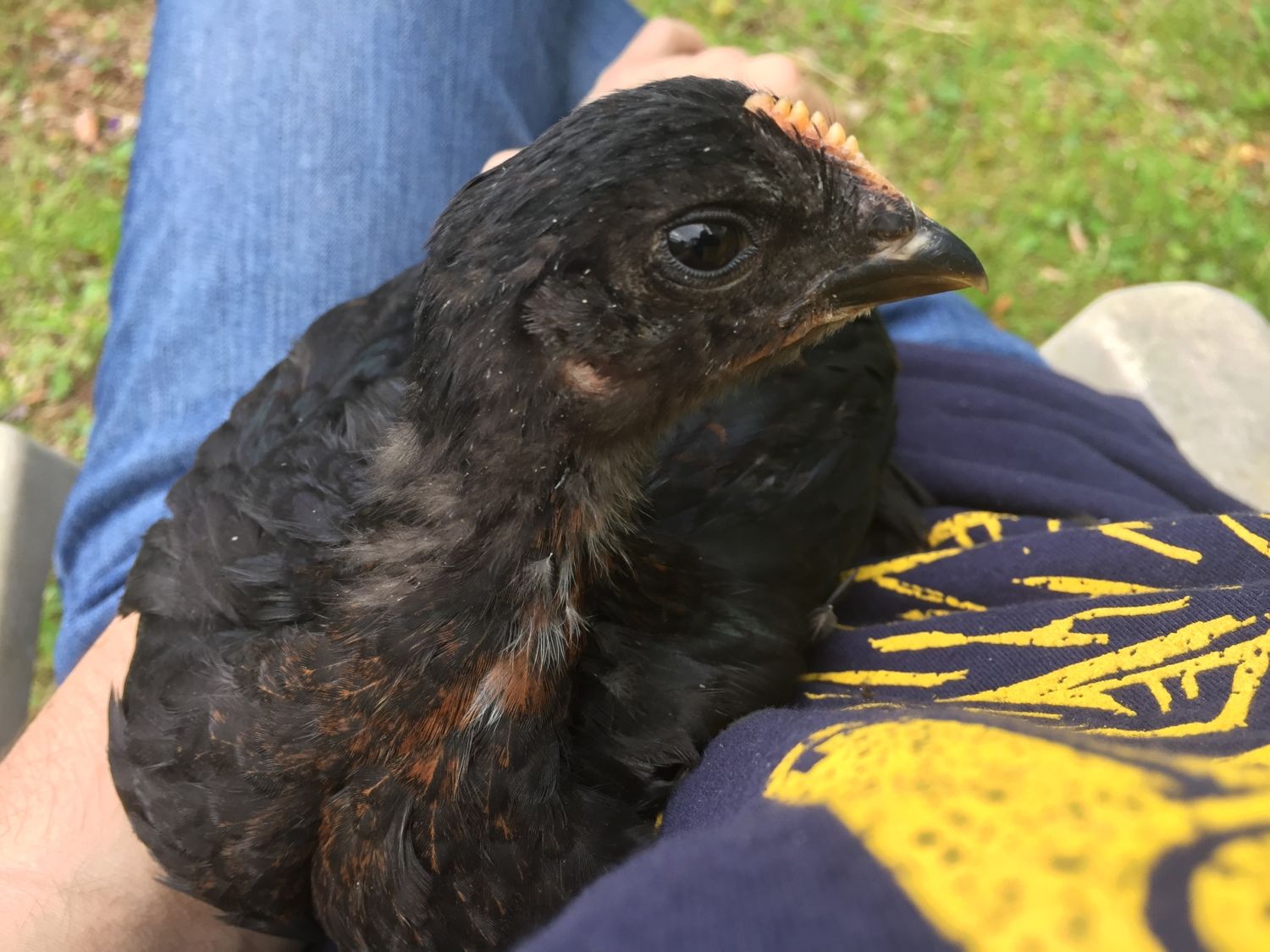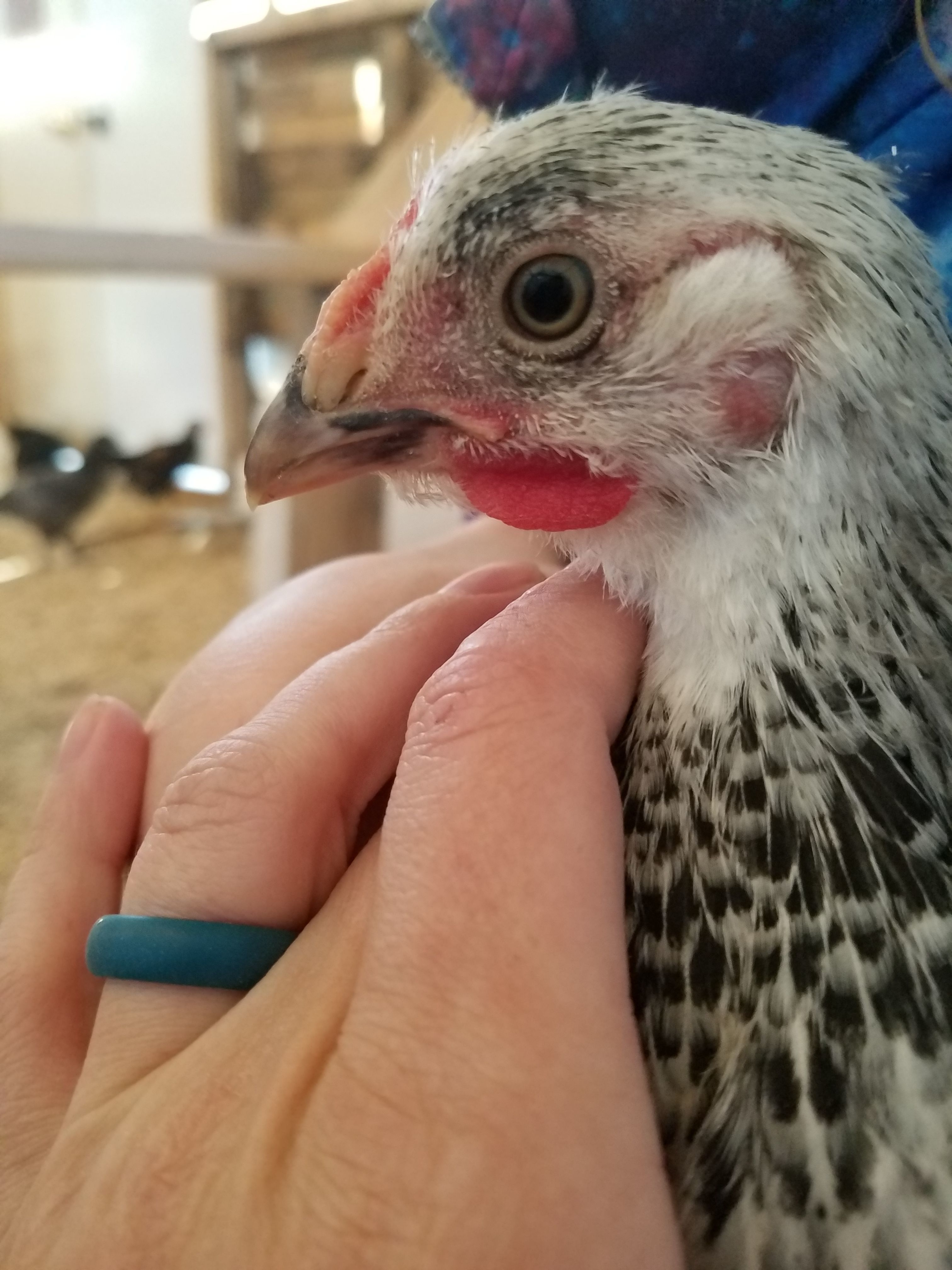I have to add that he is very very sweet and flies up and sits in my lap, none of the others do that. they hatched march 21st so exactly 1 month today. theyre all pretty high energy and do a lot of fighting(hackles raised and jumping and all), which makes me suspect males even more.