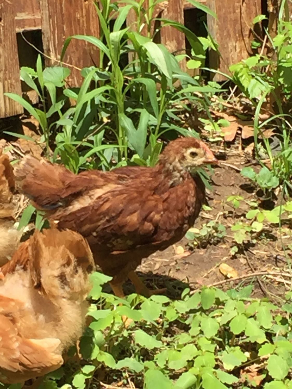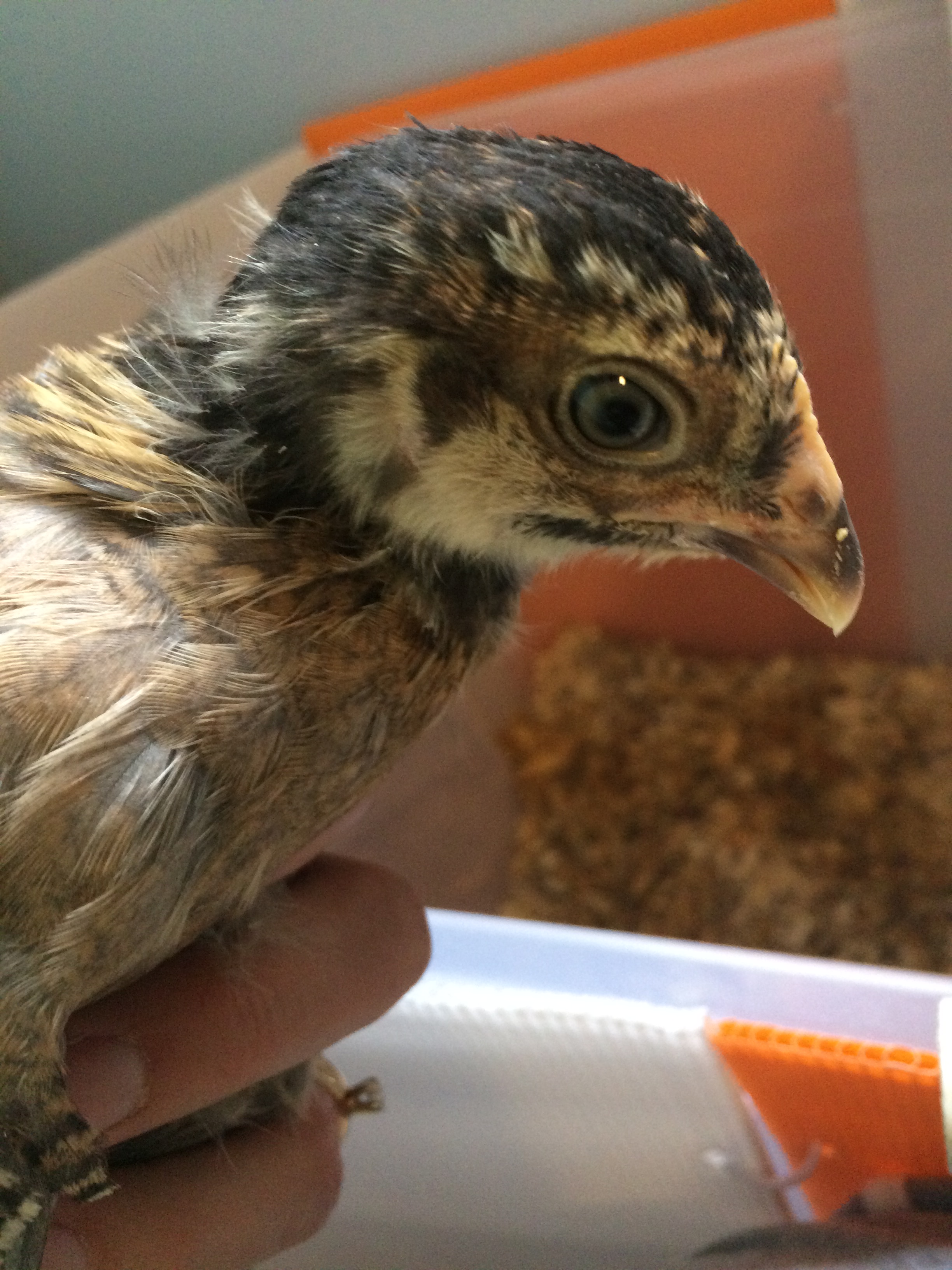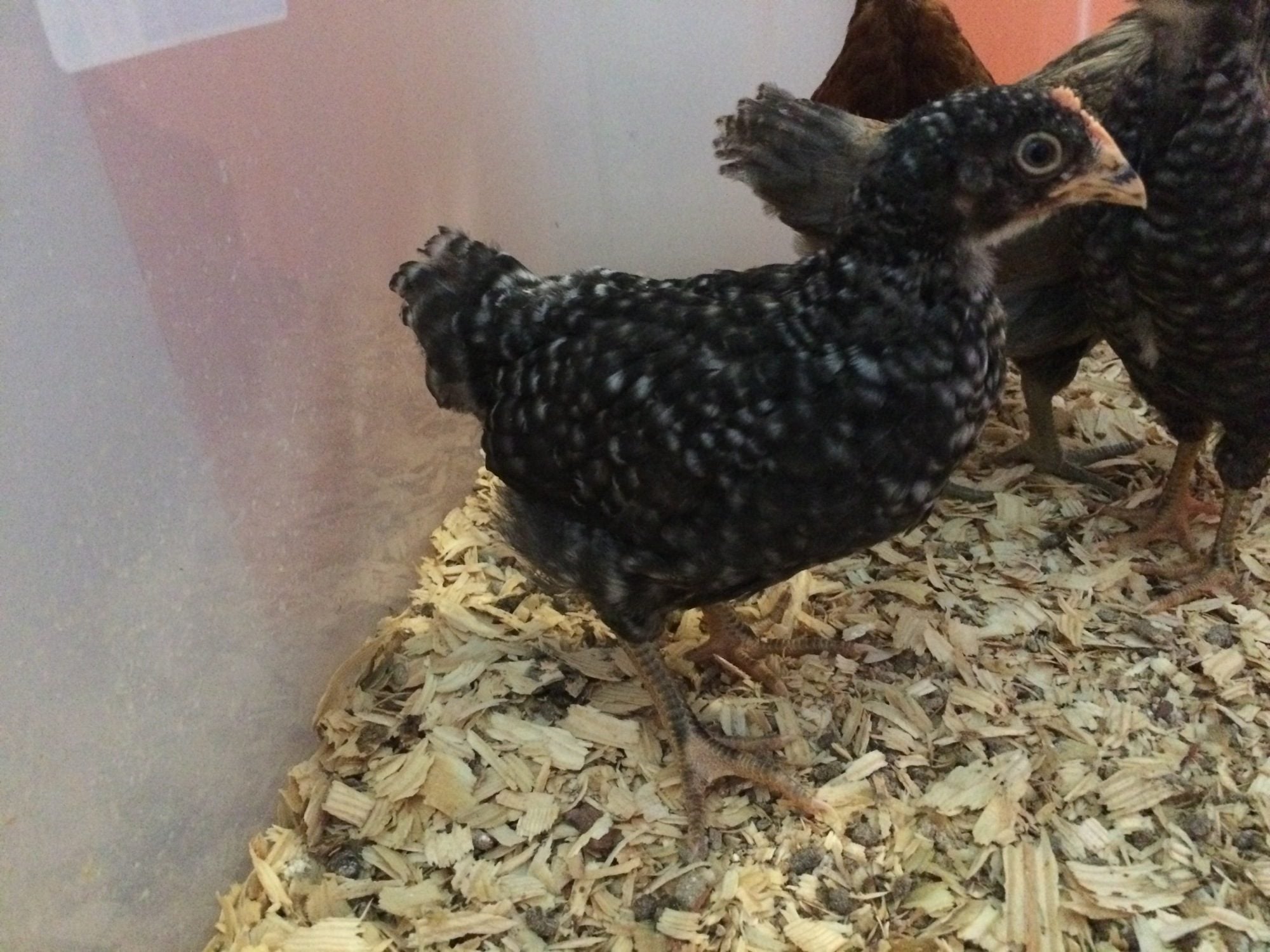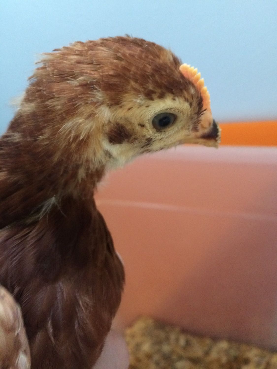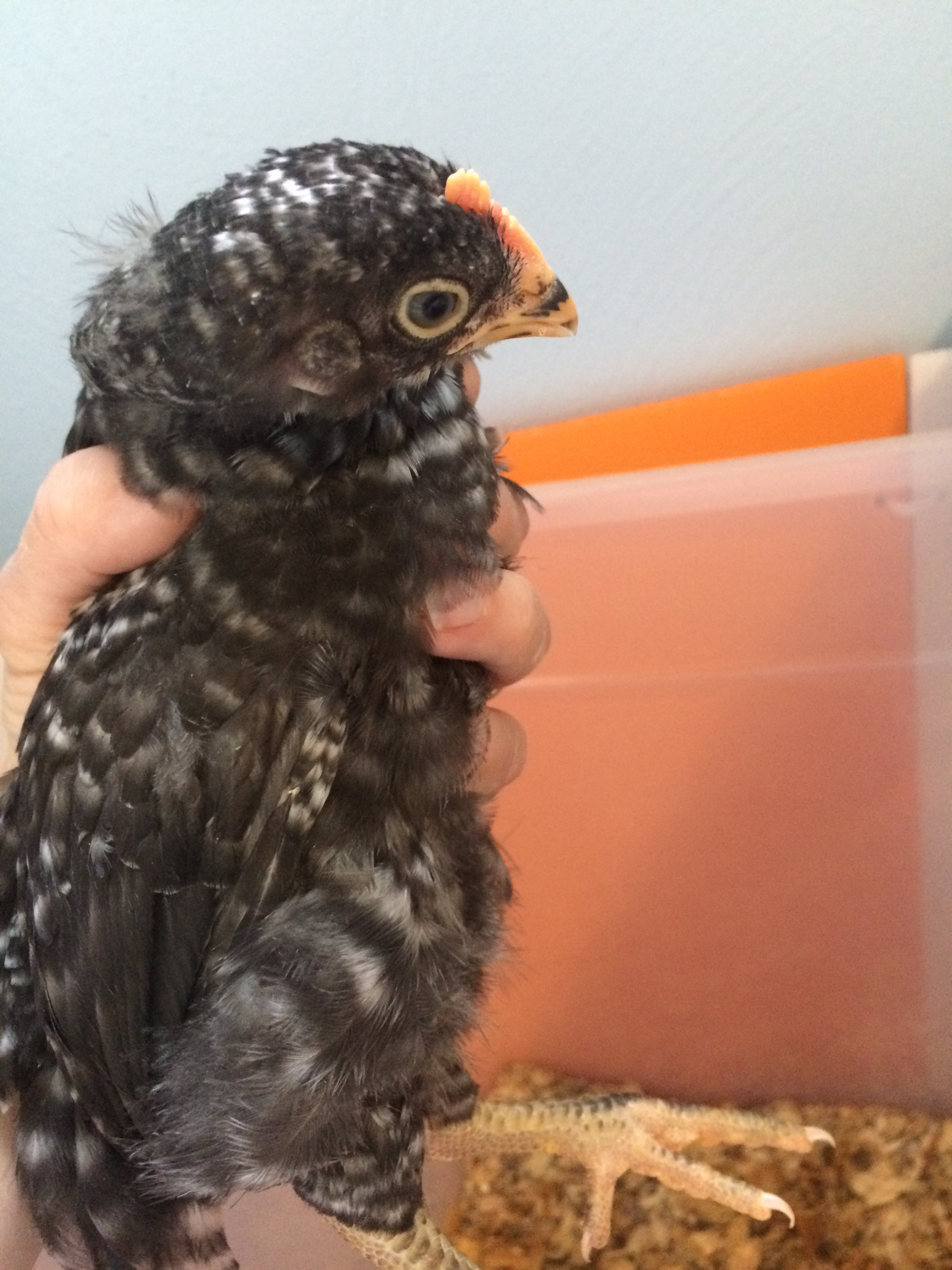 The Orp also looks like a male at a quick glance, but I am learning that not all lines mature at the same rate. (So I'd keep him a little while to be sure) My line of orps grow combs during their 3rd week - even before they're fully feathered, which is about at 4 wks. So by 7 wks, my male orps have giant combs & are fully feathered. My friend's line of orps have much shorter combs that take months to grow in size- but the wattles of both genders drop early. In his line, the males feather slowly. At 6 wks, his little cockerels still have have bald backs & short combs, while his pullets are fully feathered.