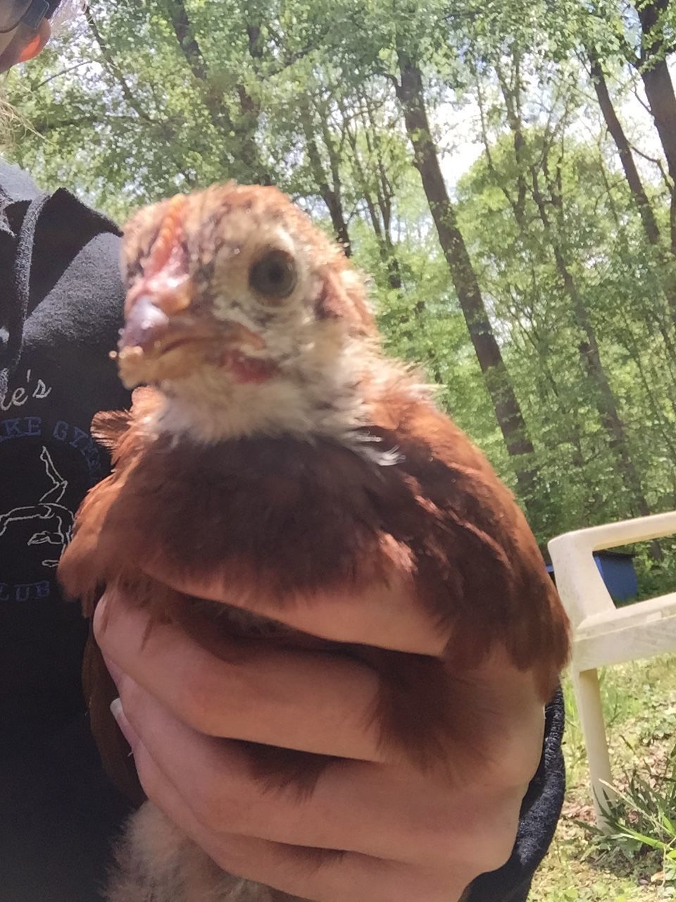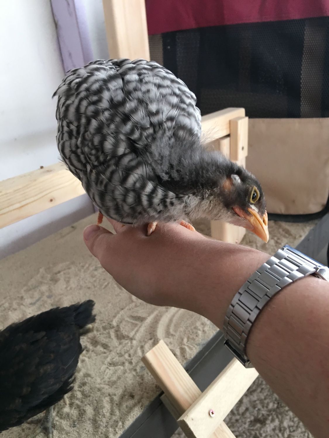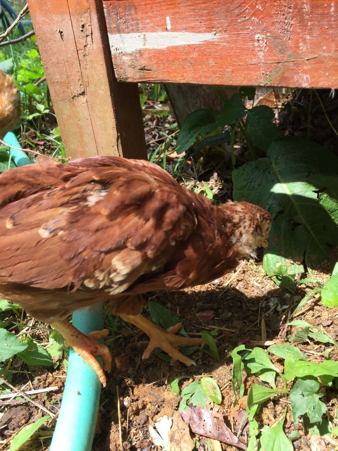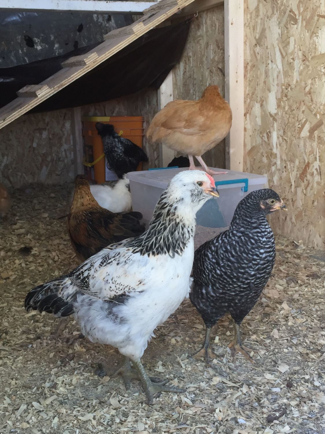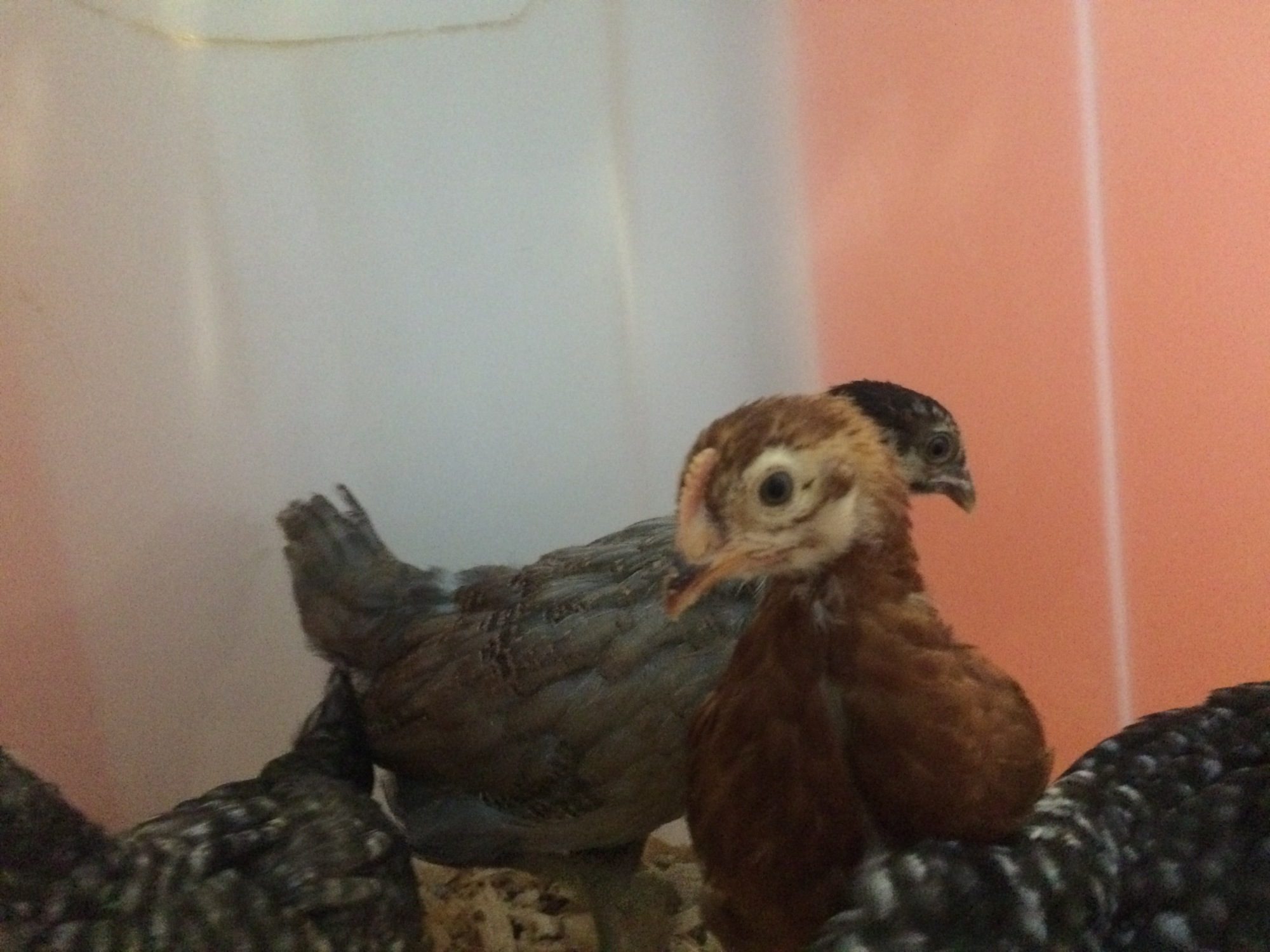 The Orp also looks like a male at a quick glance, but I am learning that not all lines mature at the same rate. (So I'd keep him a little while to be sure) My line of orps grow combs during their 3rd week - even before they're fully feathered, which is about at 4 wks. So by 7 wks, my male orps have giant combs & are fully feathered. My friend's line of orps have much shorter combs that take months to grow in size- but the wattles of both genders drop early. In his line, the males feather slowly. At 6 wks, his little cockerels still have have bald backs & short combs, while his pullets are fully feathered.