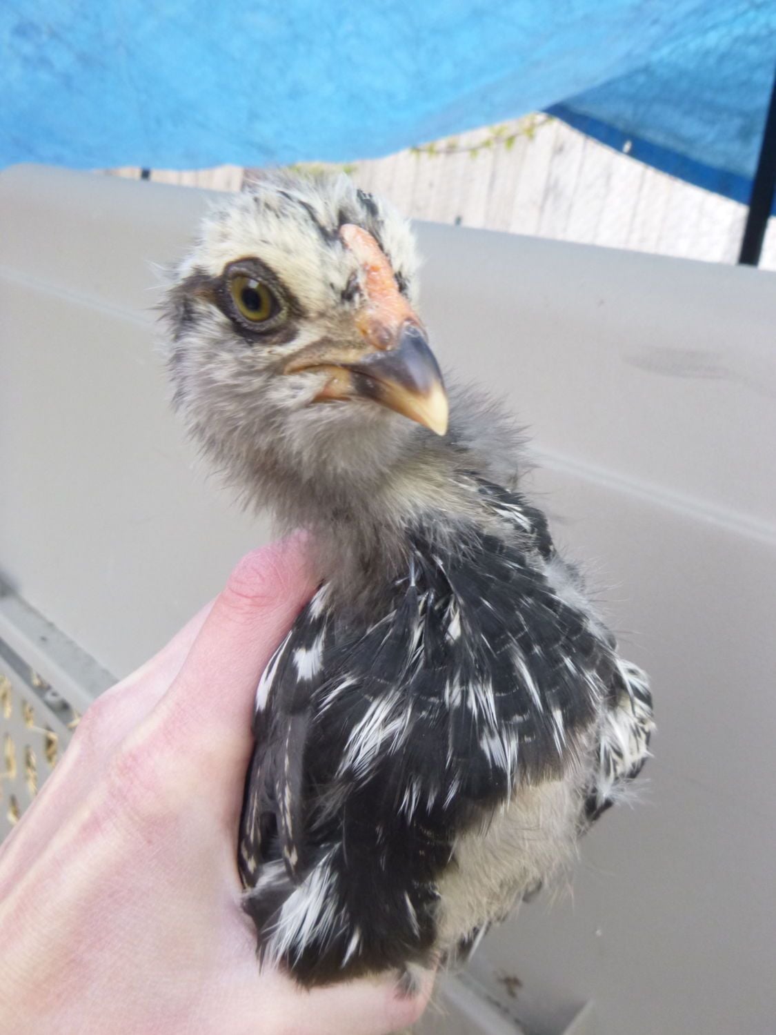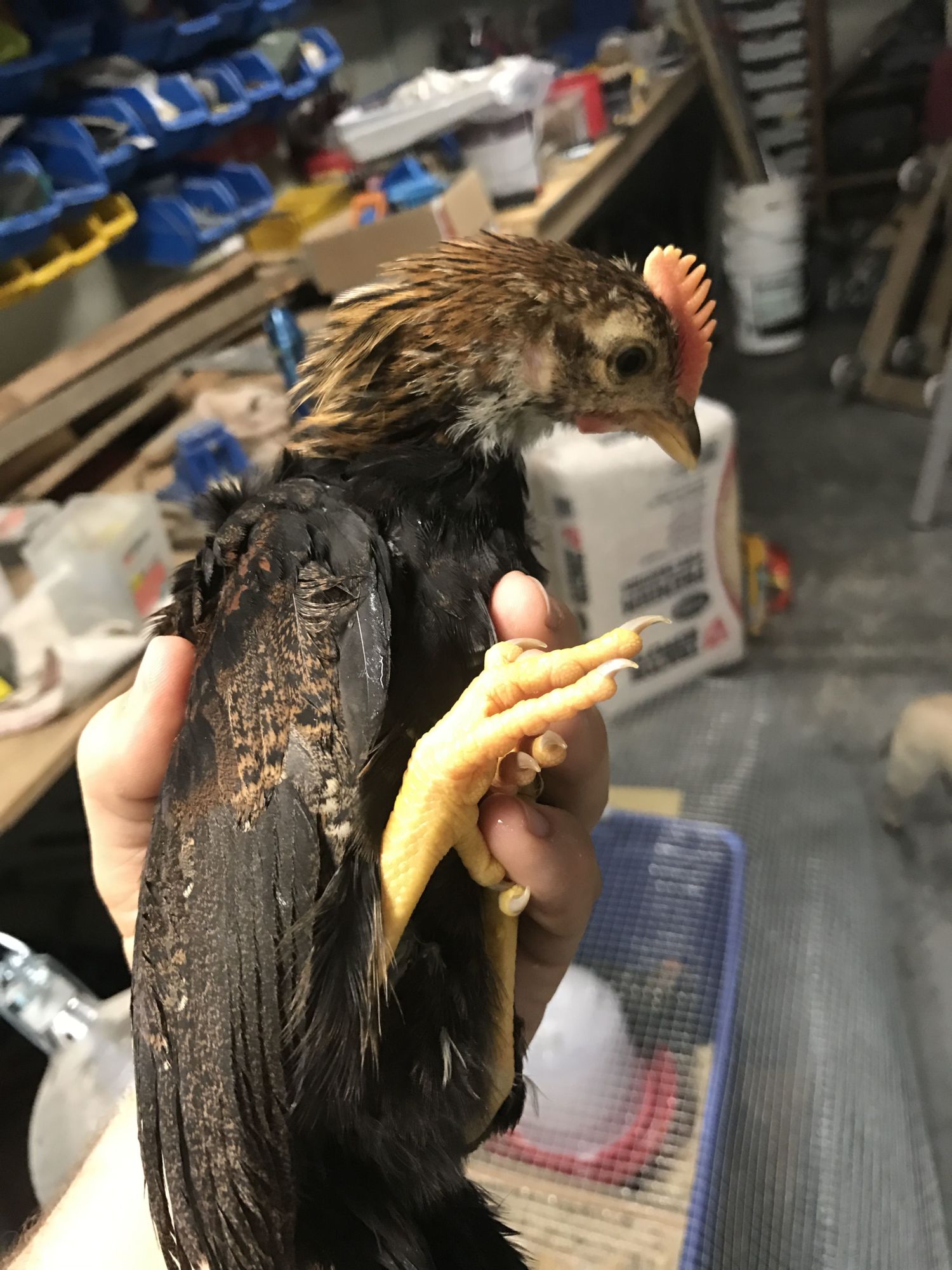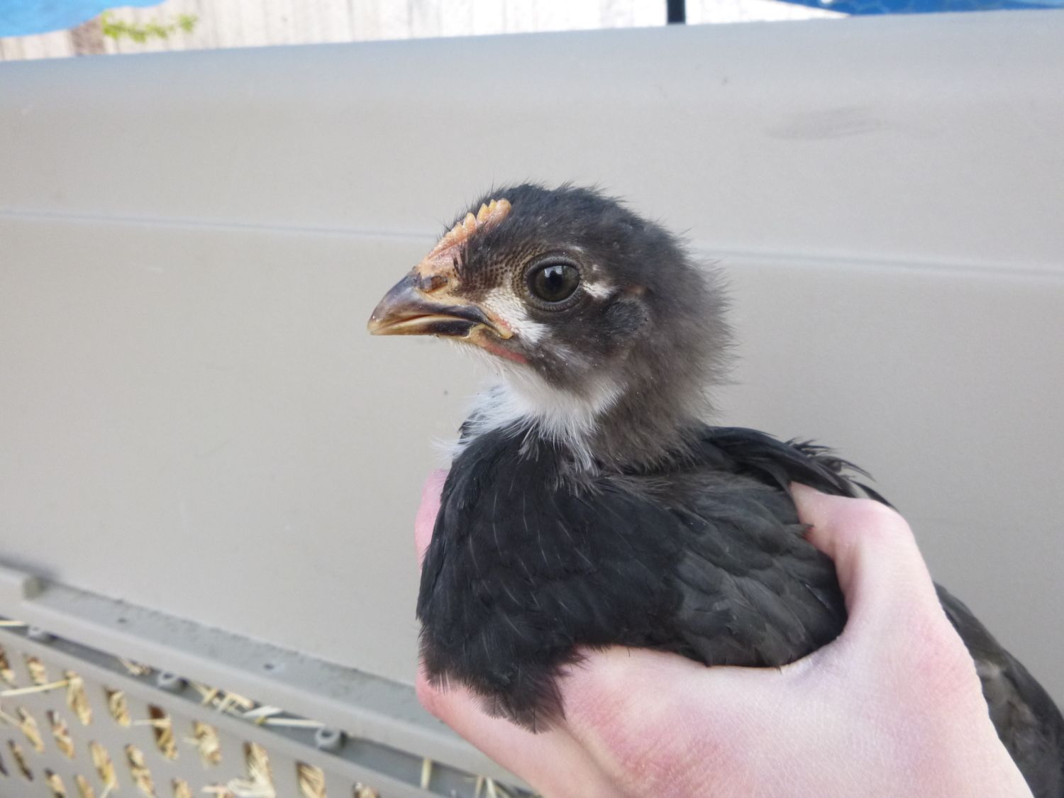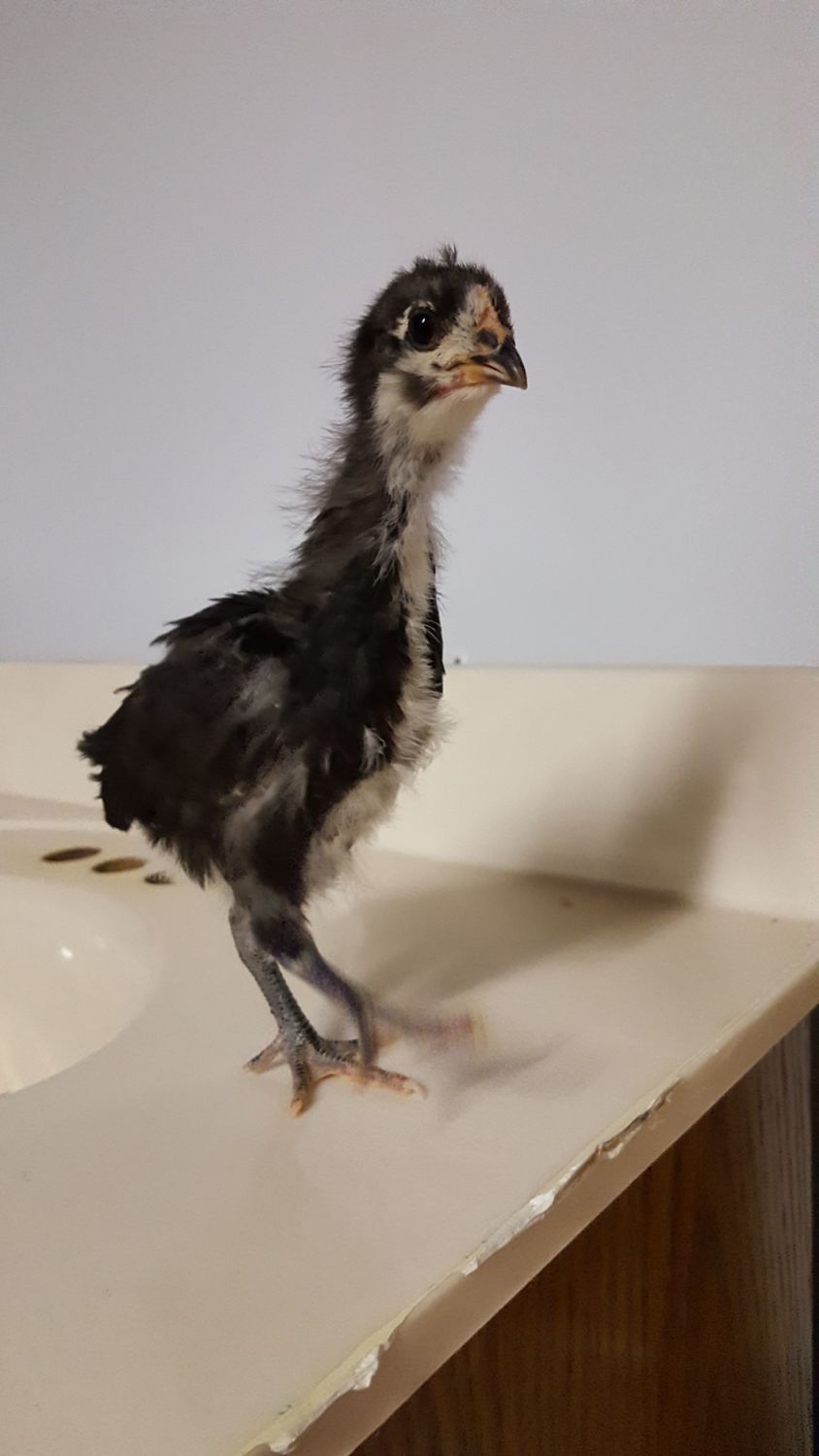 This dark blue chick was supposed to be a blue marans, but lacks the correct comb and feathered feet. I think it must be some kind of mix. Thoughts? It is the smallest of all the chicks.