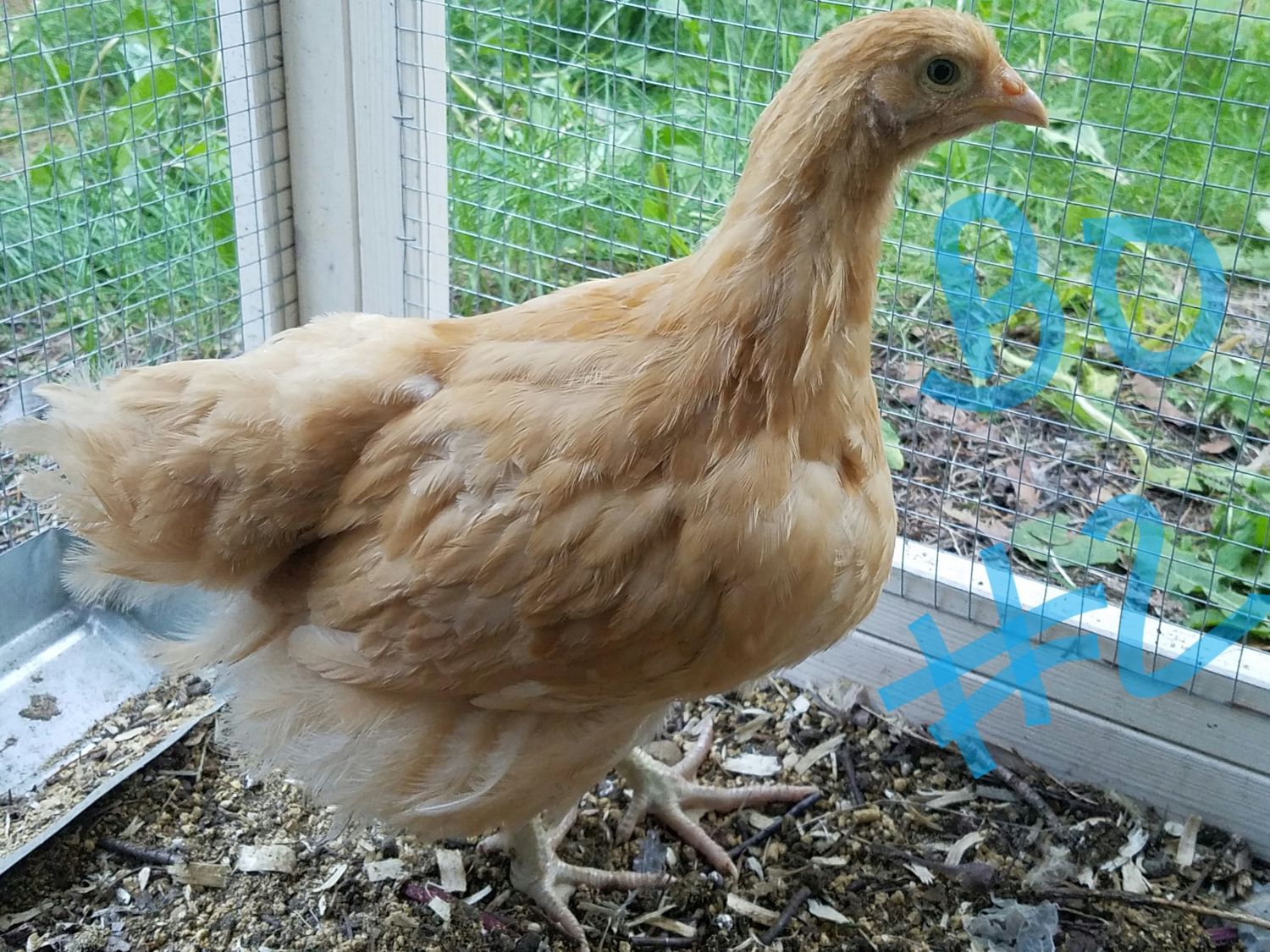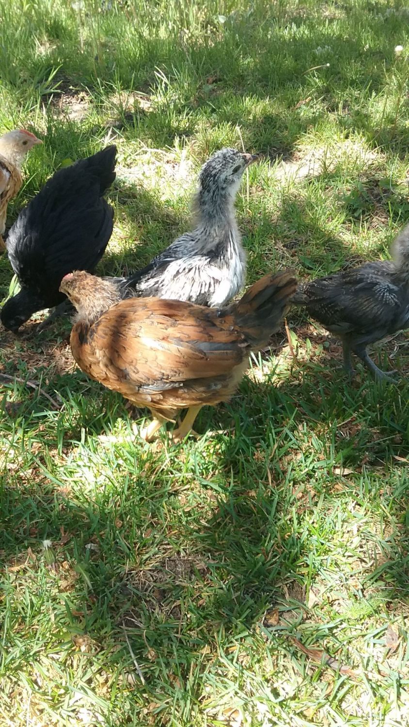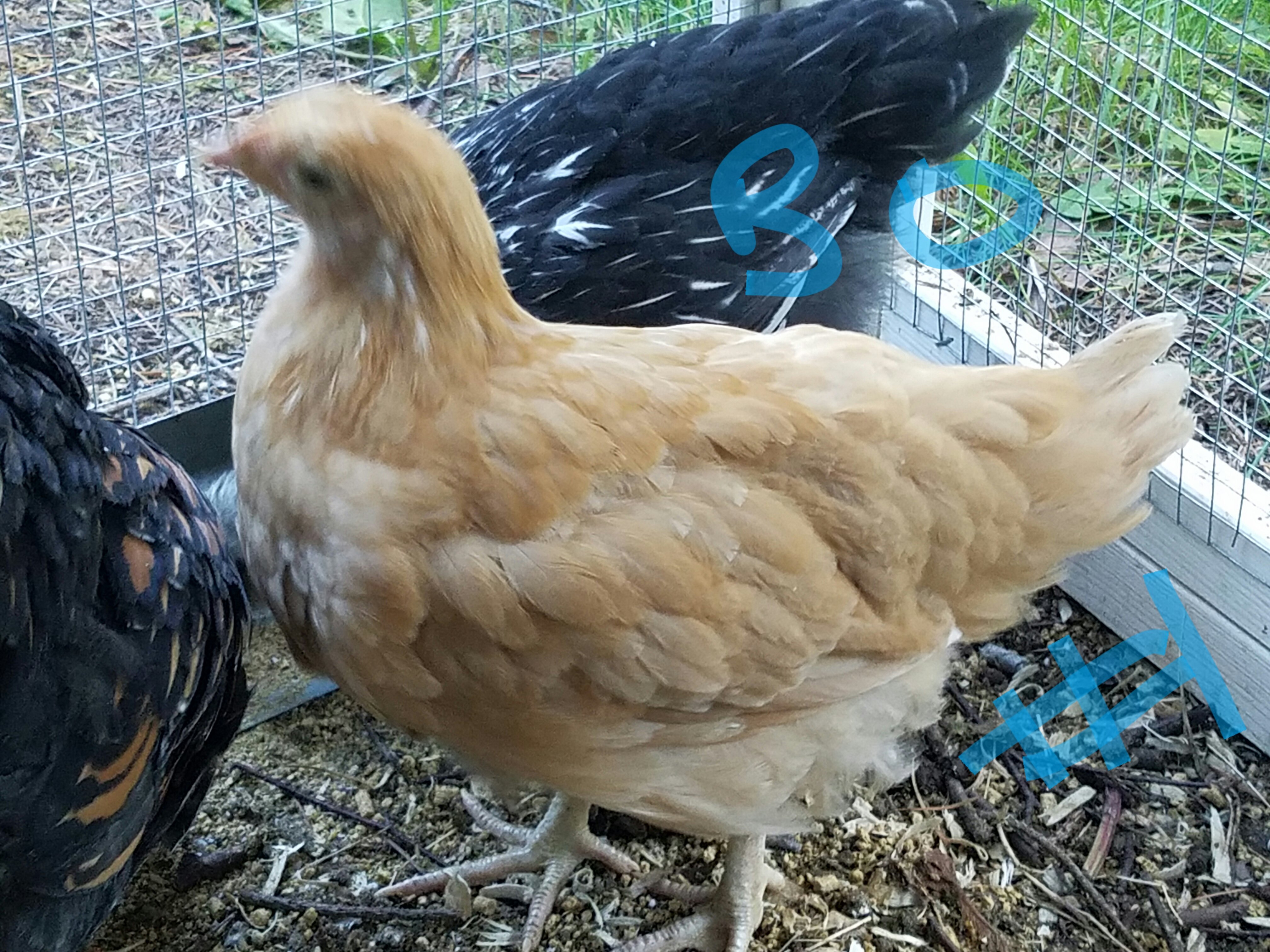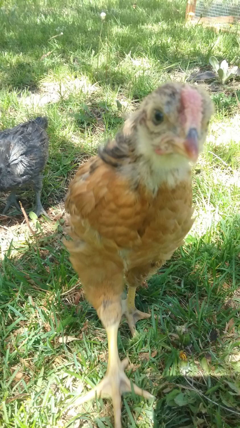 The Wyandotte is a pullet. The Ameraucana is looking like a cockerel. I see dark blue male saddle feathers just starting to come in.