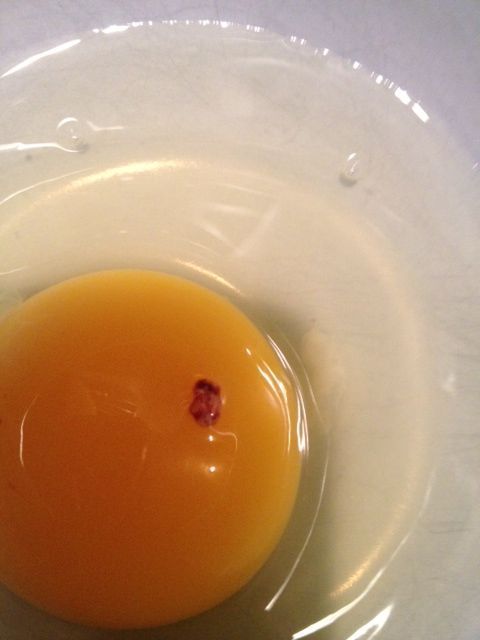 Hi I'm not sure whats in my brown eggs they are layed by Barred Rocks the Polish chicken and the Auracanas are fine. When I crack them open thy have a small biege square thing inside, though sometimes it has a redish tinge it doesn't look like a blood spot up close though. Can anyone help ? Oh and the Auracanas eggs have dots on the outer shell, this one was in the shape of a 2. Can worms show up in eggs and is that what it might be? Need help don't want to eat them till I know.