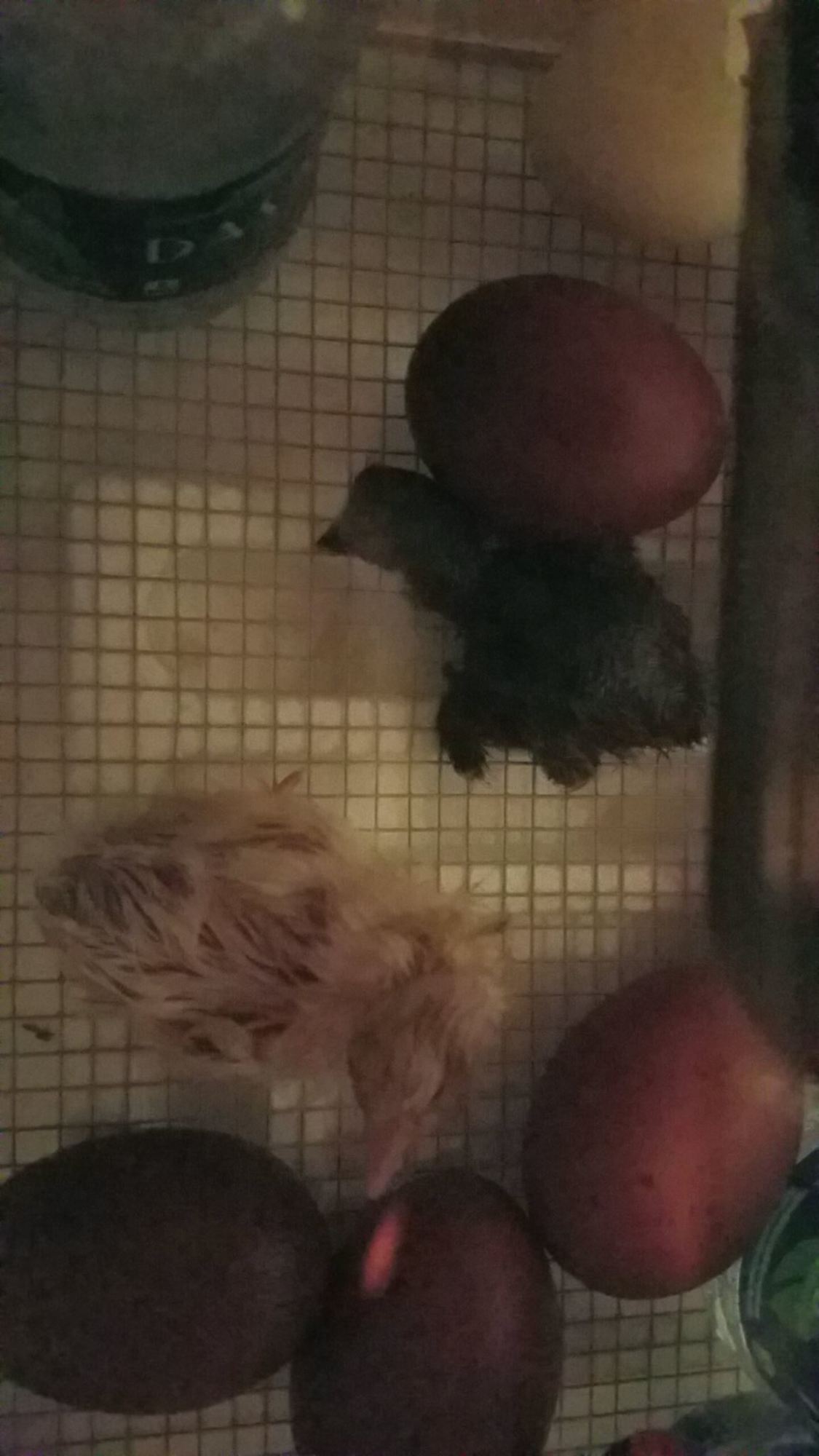 The black one above is a bantam cochin/silkie mix and the yellow is a buff polish/sussex mix.