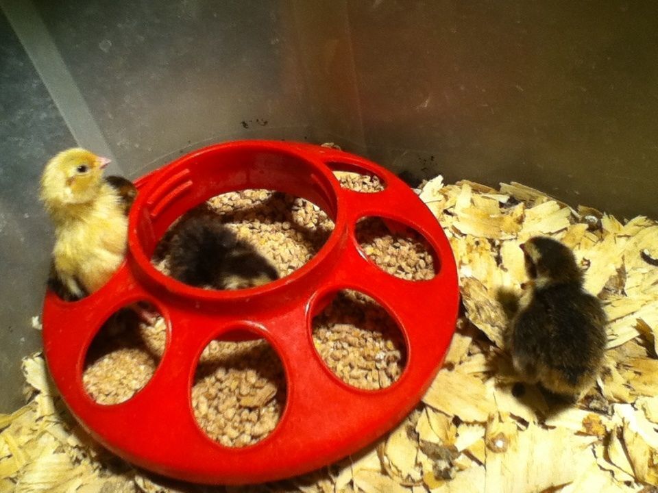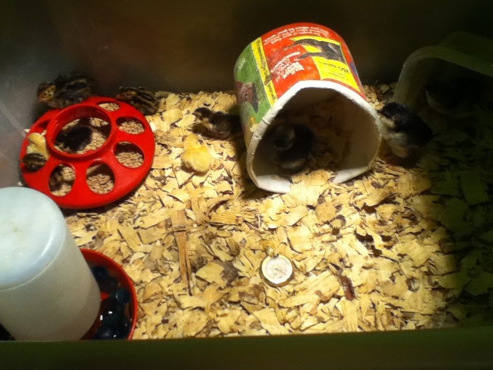 1 black Ameraucana bantam, 1 blue Ameraucana bantam, 1 black silkie (with a vaulted skull!), and 7 coturnix quail of various colors running happily around the brooder together! (I think I may have already posted pics here yesterday or I would again!) ((After checking, nope! I didn't! So have some more chicky-pics!))