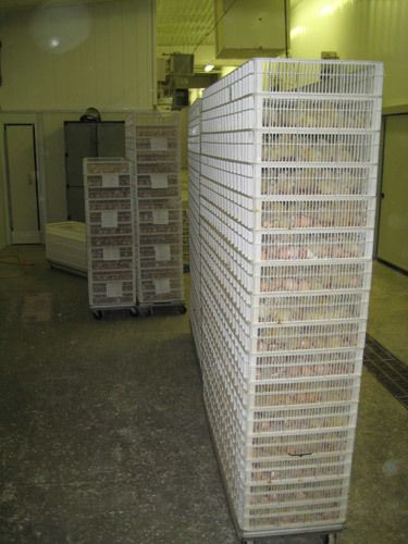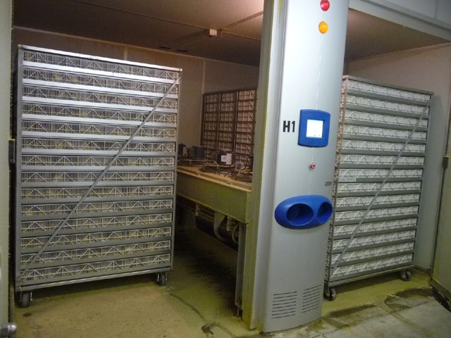 Once in the hatcher trays they go back into a rack.. when the rack is full of trays it gets moved into a hatcher. Once the hatcher is full of racks the door is closed and it's "set" (proper humidity and temp for hatching). As the humidity drops below the required amount (remember they are in climate controlled rooms.. so they can set in their tried and true requirements) the misters will come on misting the inside of the hatcher as well as the eggs.