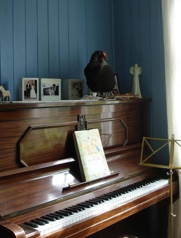 Name (if applicable): Carmen Age: 3 years Breed: Faverolle/Isbar cross Catagory: Best Poultry Pet About (optionable):Carmen is my mothers hen and besides laying beautiful, green eggs she's a very special lady! She enjoys her own company as well as ours and will sneak inside the house unless prevented. This photo was taken when she had gotten inside despite the fact that all of the other chickens were in the garden. The piano is on the second floor and she was obviously admiring the wedding pictures.
