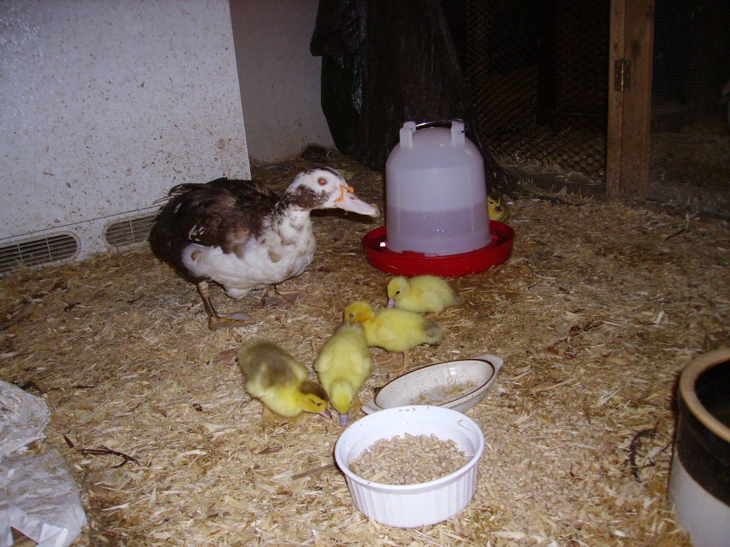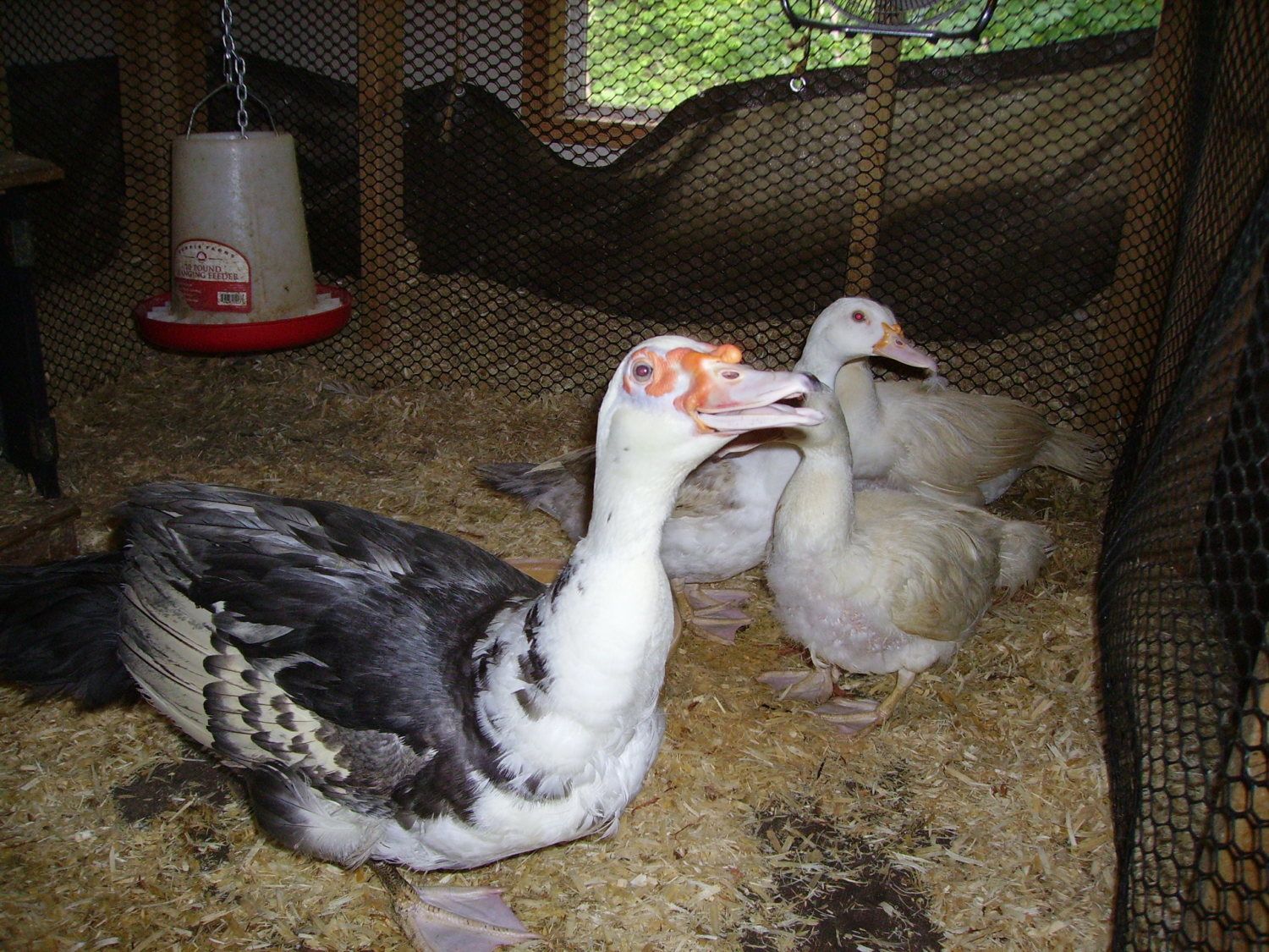 Ducks are so totally cute and fun. But boy-o-boy are they messy. I tried to have them in with the chickens but they slobber water all over inside the pens. Then the shavings turn to ice blocks. Wish I had a different set-up or knew how to deal with them better. We only have 3 Mandarins. No quacking out of them either. Strange drumming an squeaks.