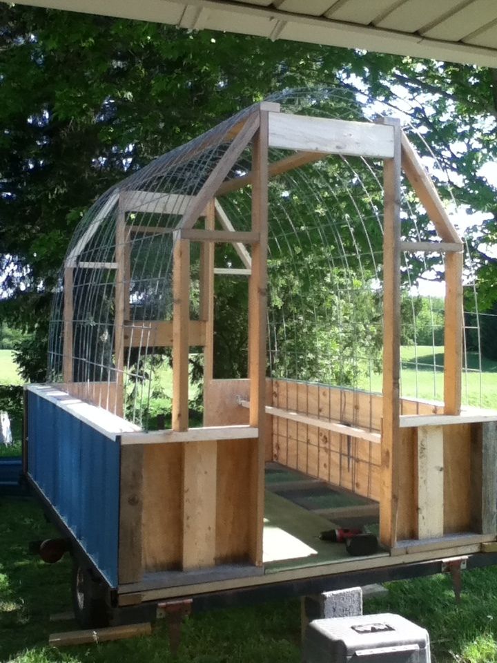 These are pics of my hoop coop on a trailer frame when it was in progress. Built it a year ago, stored inside the horse barn over winter. Tarp is holding up well, so far. One thing different I would do to help the tarp hold up would to be protect the edge of the cattle panel with an old piece of hose cut open lengthwise and slipped over the panel edge. That is the major wear spot, where the panel intersections rub the tarp. This is just a regular heavy-duty tarp from Lowe's. For winter I would like to get the nice clear tarps, so more light gets in. The chickens are locked in only at night. This is a 6x8 trailer frame. Used the full cattle panel (although I would recommend cutting down, so the tarp actually reaches the 2' side wall - thought for next time). Tarp is 10x12. The first pic you can see the drop down door for chicken and people use. The upper half is a hardware cloth covered window that can be swung up so you don't crack your head when cleaning.