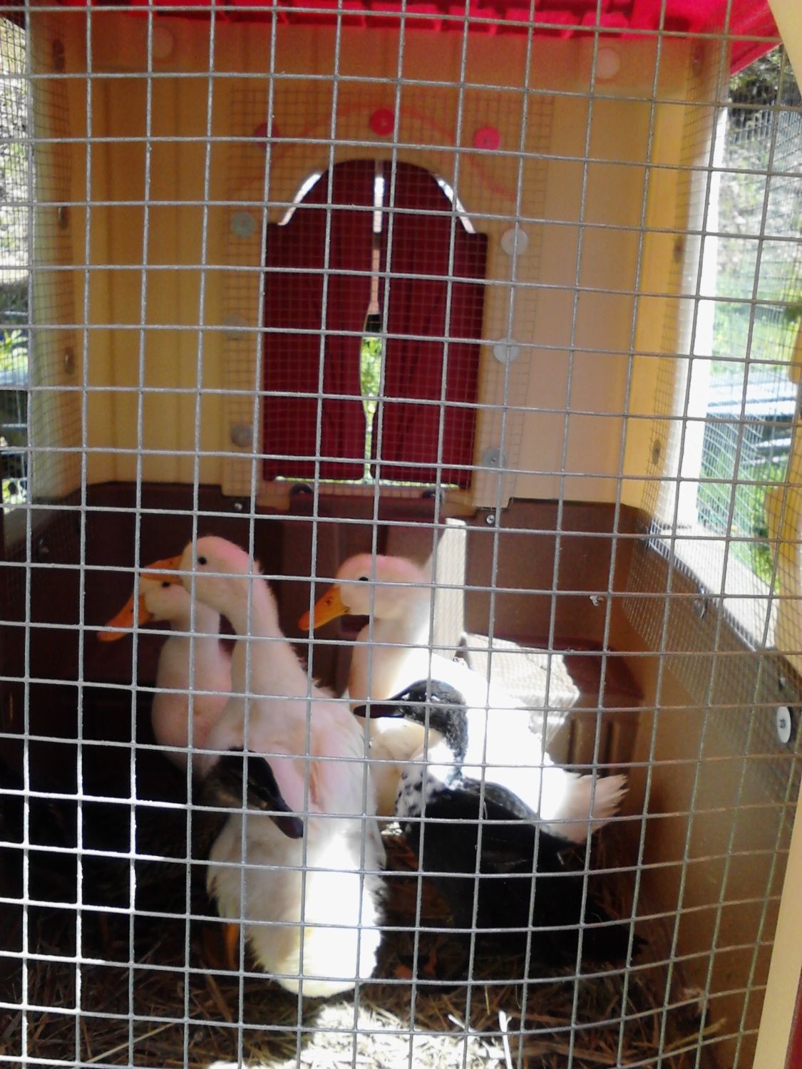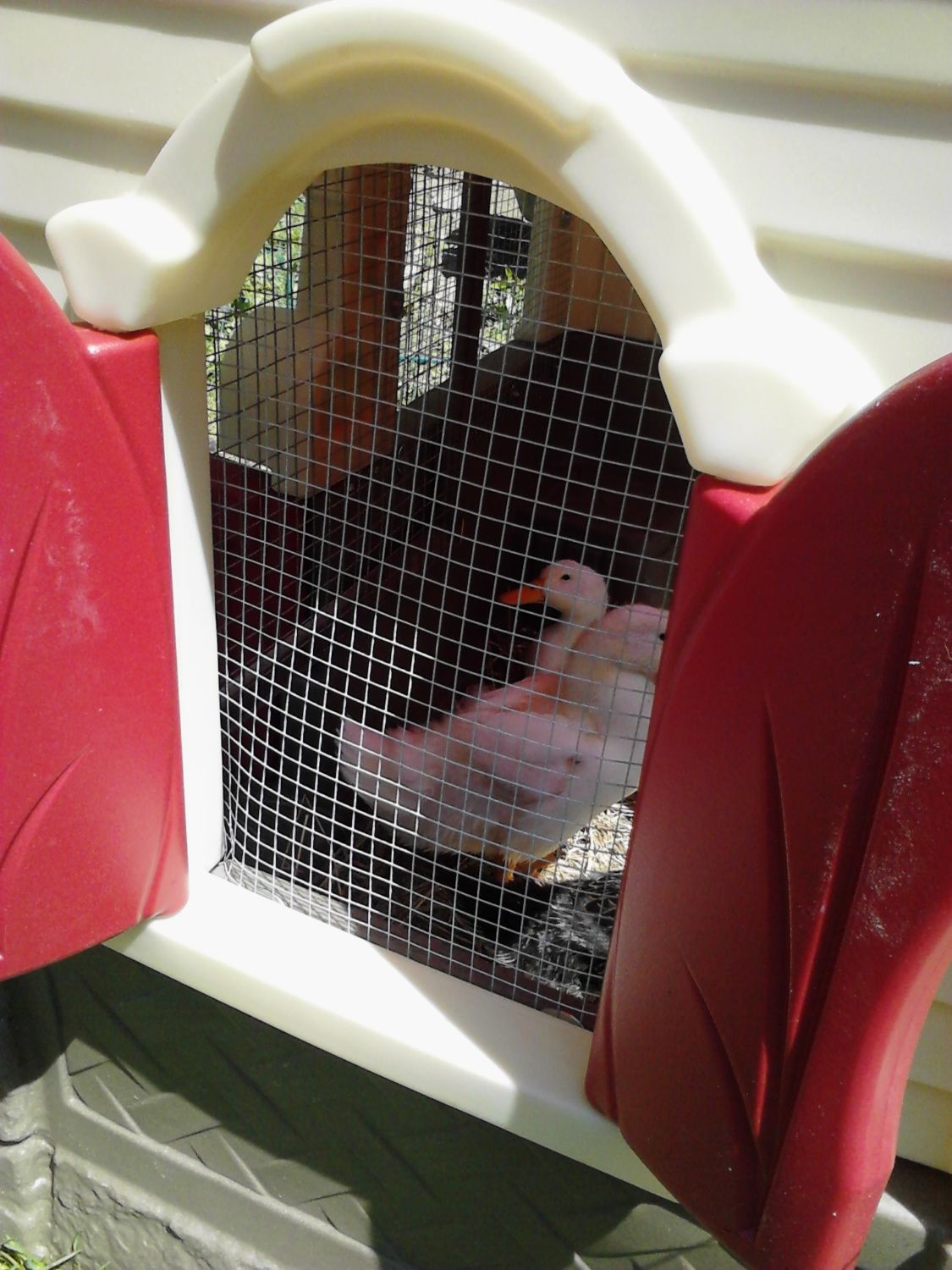 or open. Here you can see the 1/2 inch hardware cloth in the window. You can also see the ducklings and you have no idea how excited I am that those little farts willingly went into a structure.