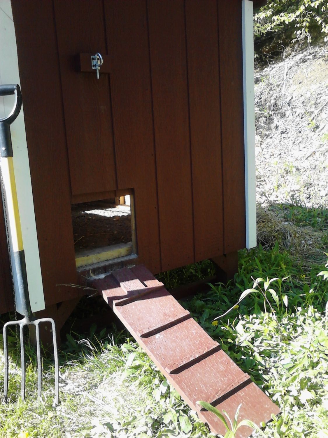This is the chicken door, it has the regular slide down door, and for added security the ramp flips up (covering the door) and bolts down with the fastener thingy at the top. The exterior of the coop was pre-fabricated, but my husband and I did a lot of work on the inside and some extra stuff on the outside.