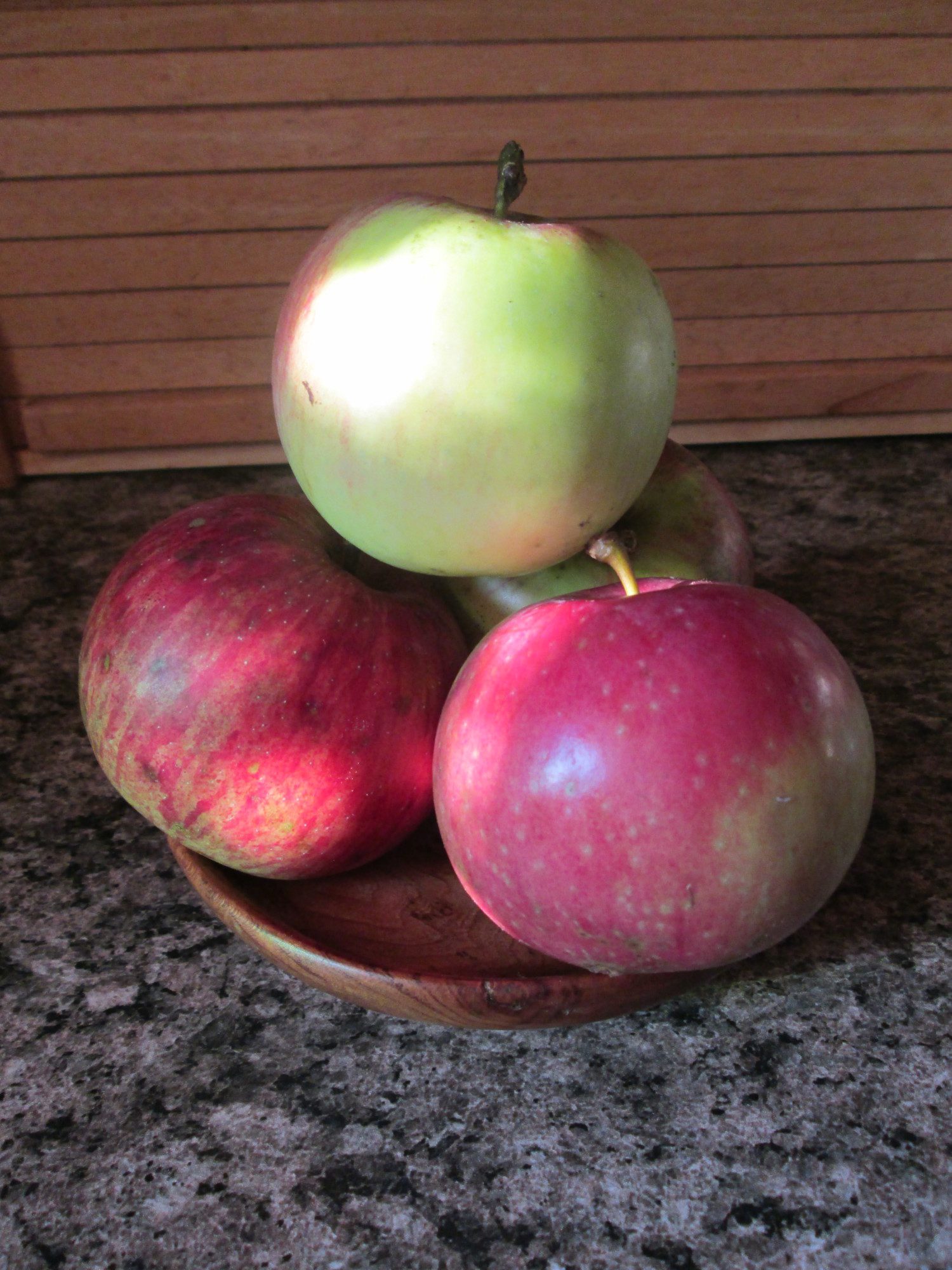 These are few of the apples my dad sent me yesterday. They're from a wild tree that grows along the road just down from their house. Some had blemishes which I used in applesauce and I kept these nicer looking ones for eating out right.