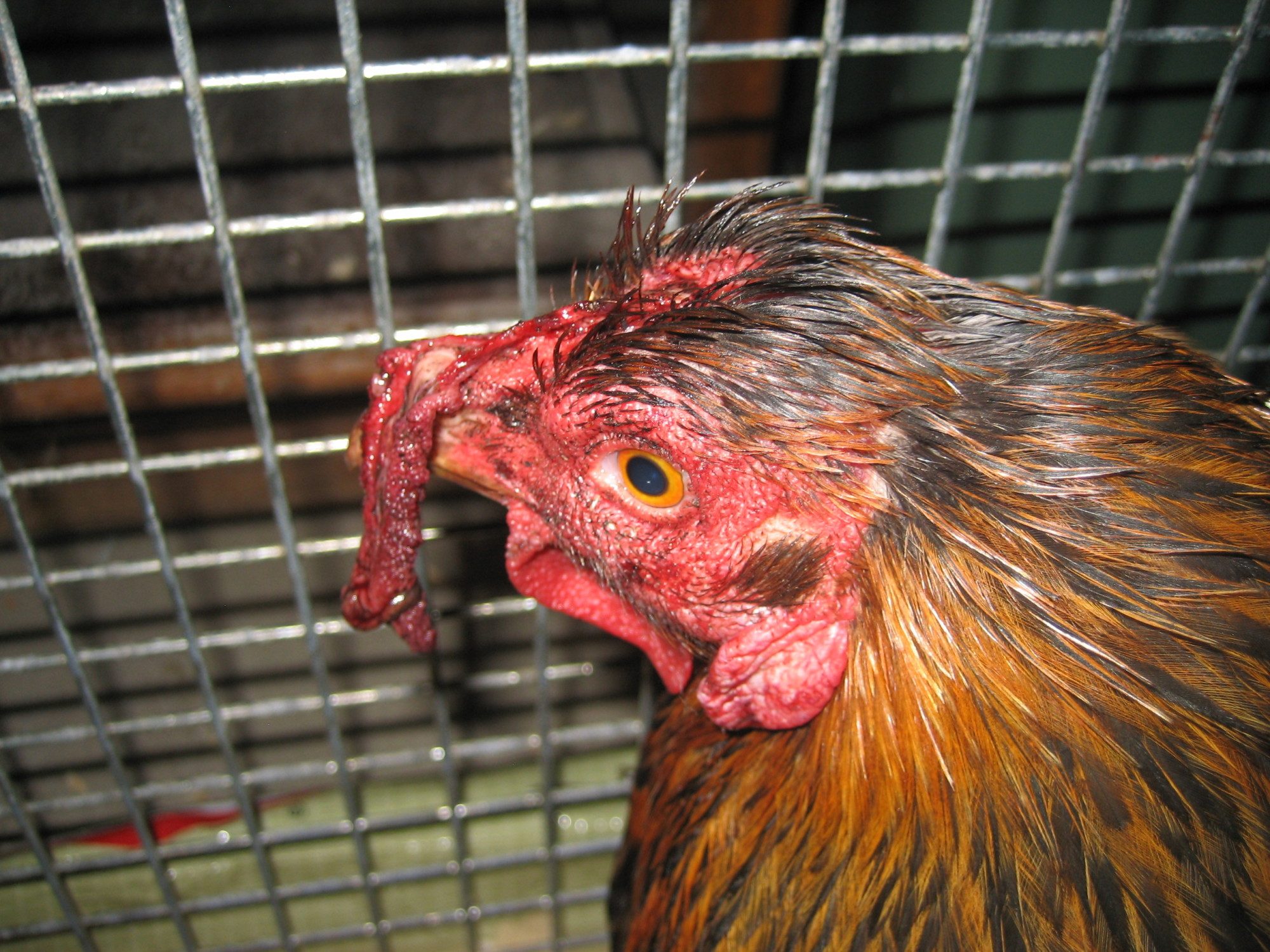 Okay folks--need some advice. This is my hen Gladys whose comb has been ripped down to her beak. Dh thinks Bill did it when he was trying to mate with her (although he didnt actually see it happen). I have her in a cage inside and have been treating it with veterimycin and neosporin. The comb has stopped bleeding now and is turning black on the sides. Should I just let it dry up and then remove it? I dont want to try it now because there seems to be some blood flow still evident. She is eating some and drinking and wants out and is annoyed that this thing is hanging in front of her face. I notice that Bill grabs the top of the hens heads to hold on while he is trying to mate with them. None of the other hens show any injury and he is still getting the hang of it. For now, he is being left in the run while the girls are out freeranging. I dont want to cull him as he shows potential as a great rooster. Dh would like to do him in now. Anyone else ever have this happen?