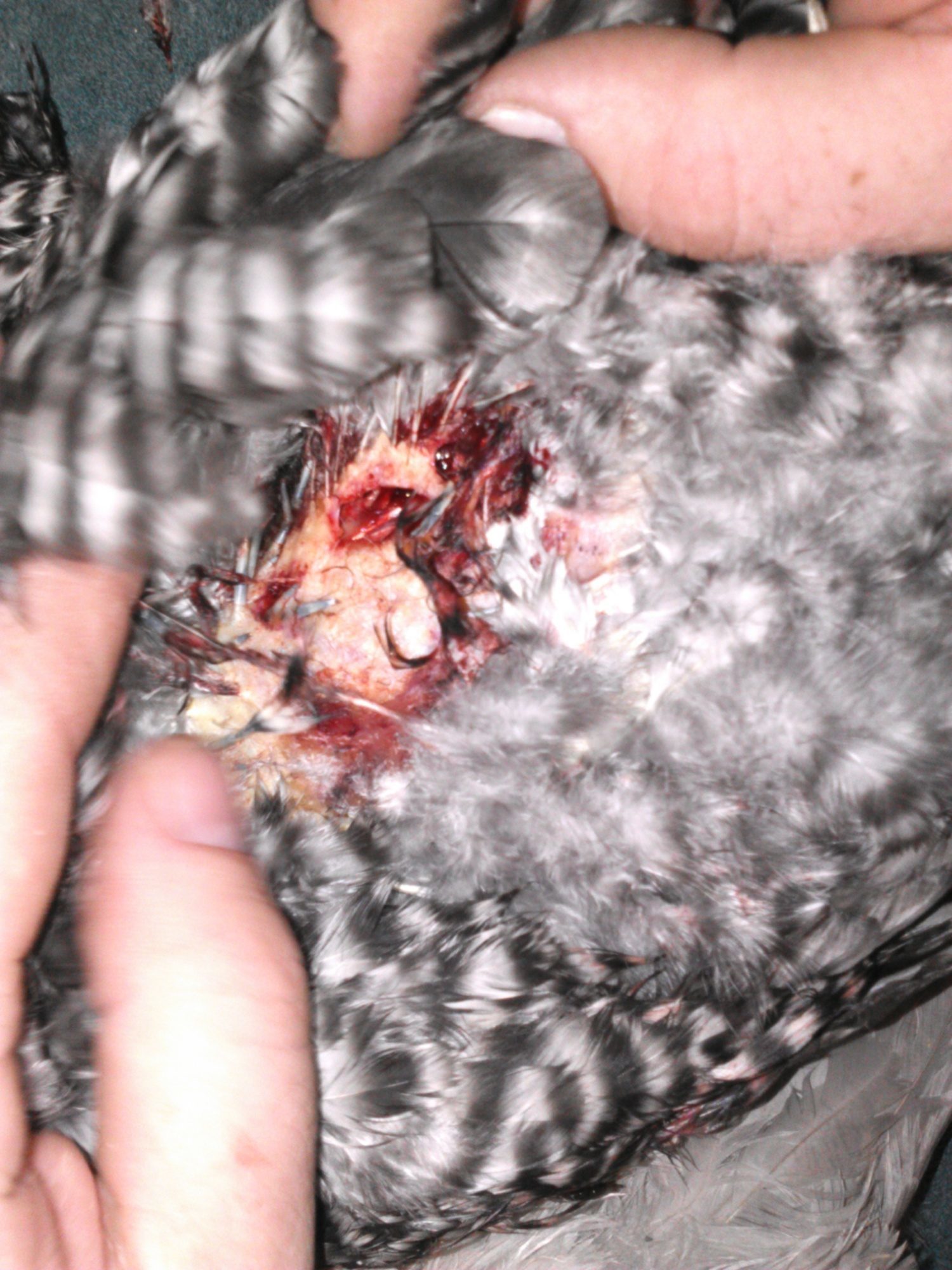 Not many feathers are missing on them and only wounds I can find are on back but after looking at them looks more like a claw than bite mark and only on the back. I'm wondering if my tom turkey who has been chaseing my roo some has now tried to mount the hens and killing them. Or a bird of prey but the only problem with bird of prey is the fact that none of the chickens I have found so far are eaten at all. Here are a few pics of wounds maybe tell me what you think.