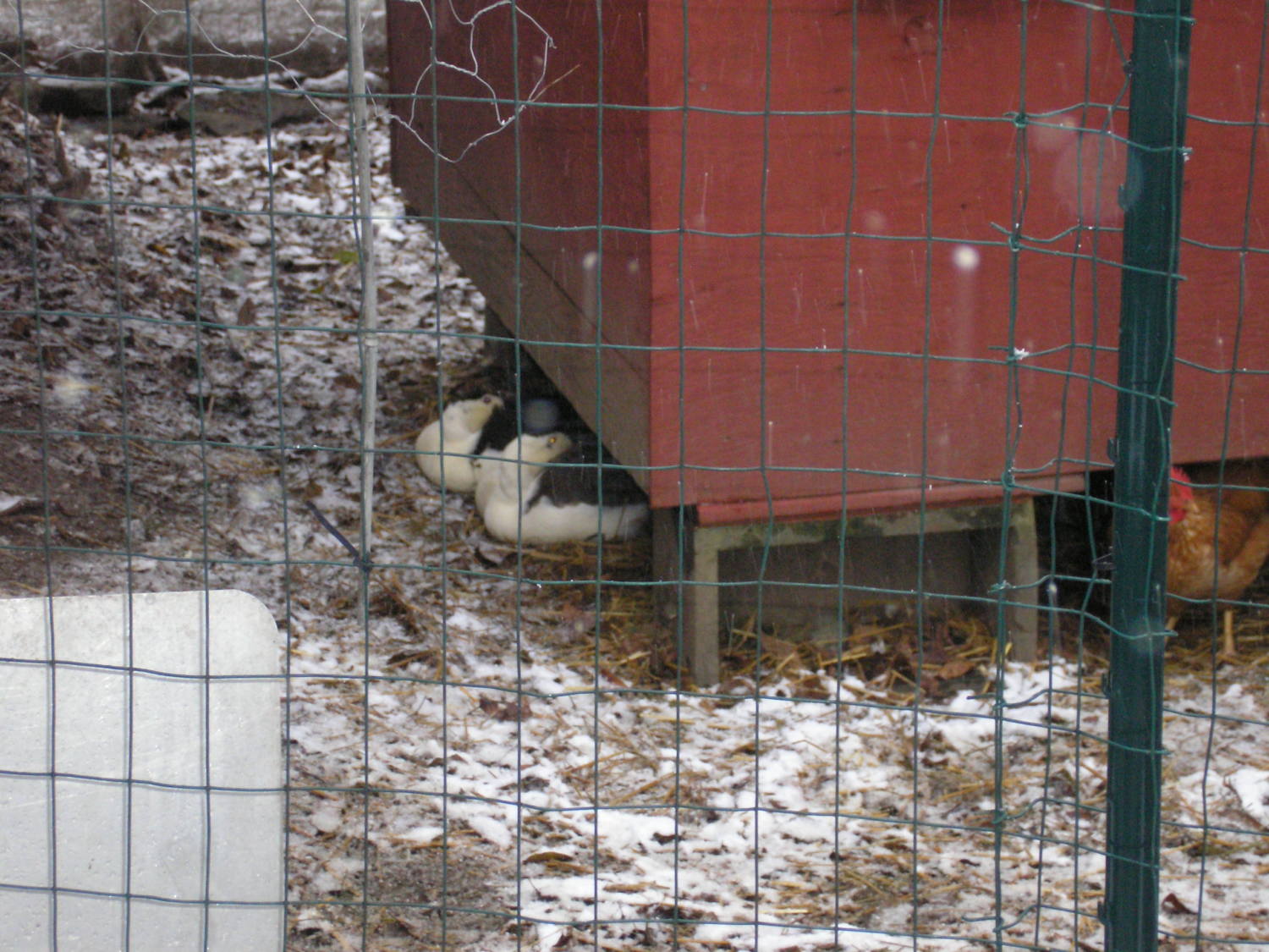 Everyone is snuggled under the coop to keep warm!