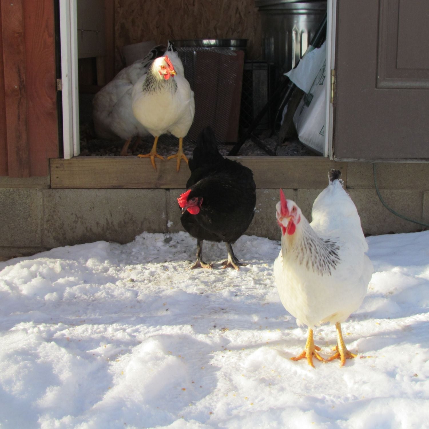 I let the big girls free range for a little bit this past week. I knew they wouldn't go too far (as you can see)! They do NOT approve of the "white stuff."