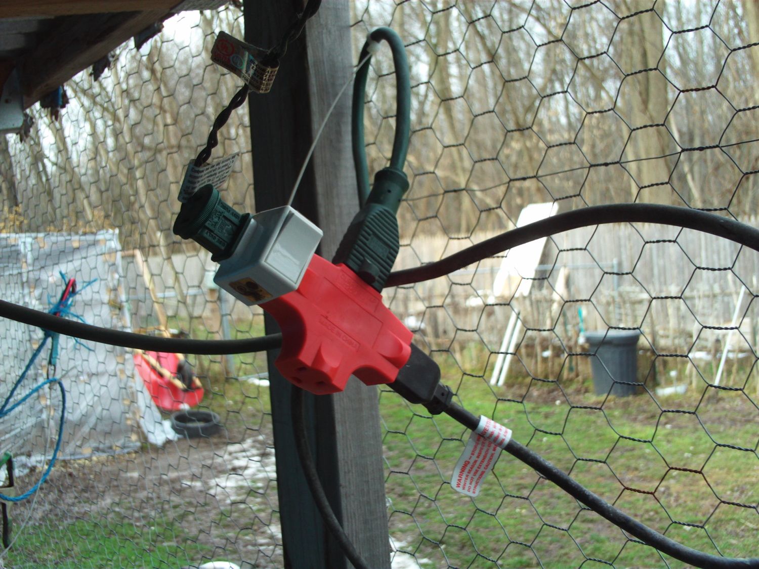 One of two water buckets with nipples and heaters. The mice traps on top get set at night to catch the occasional mouse.