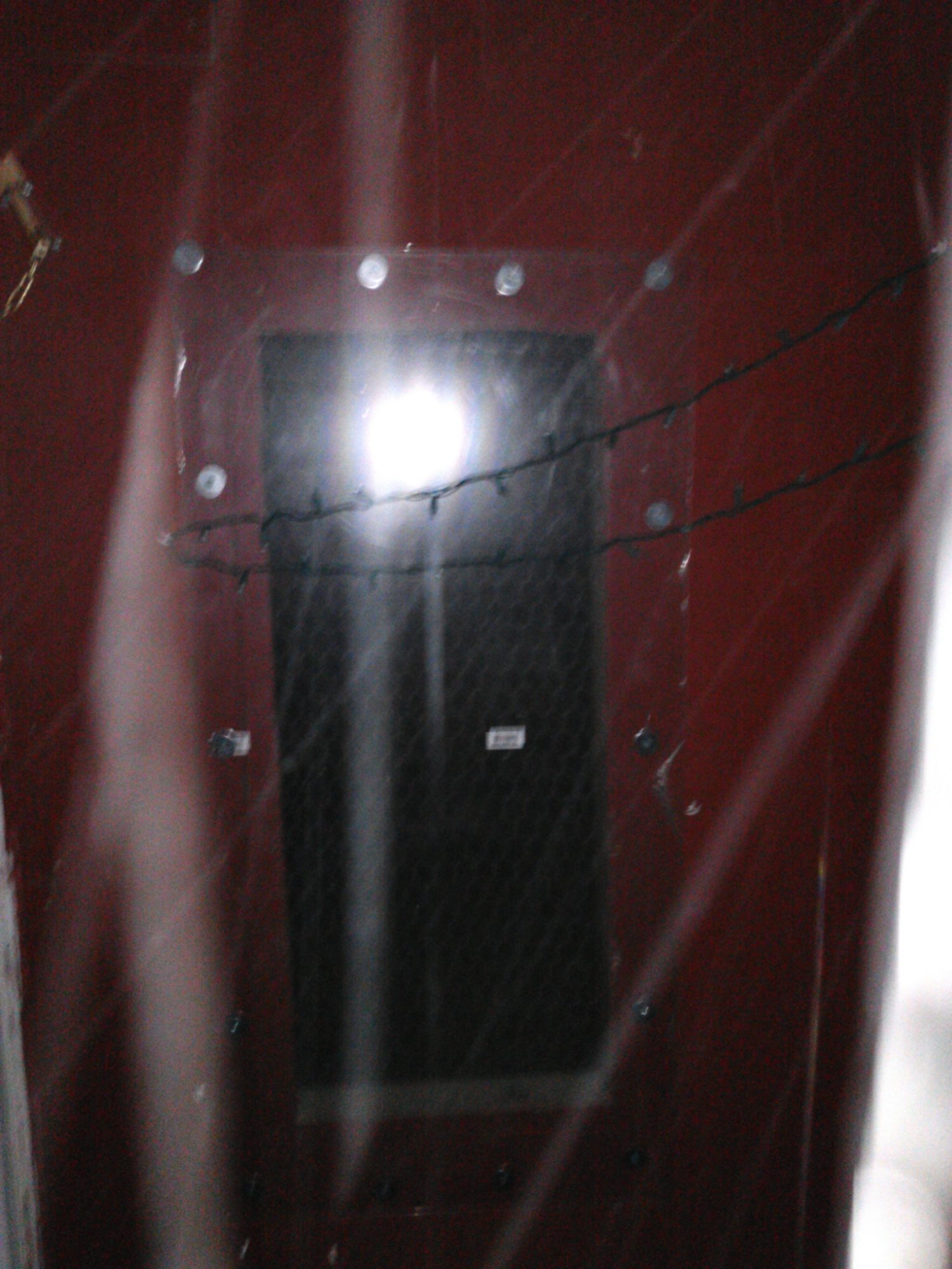Same window but from back side of coop instead of front. you can see my x-mas lights across the out side rafters inside they are ran about same way little white hooks from walmart.