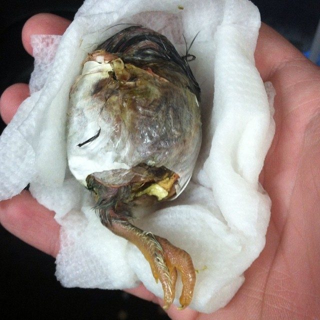 Took it to the sink, ran warm water and wrapped it in a paper towel. Did my best to rehydrate the membrane and get the chick out of it. Took my time, went very slow. I didn't read any of the help pages before hand, it just seemed like the right thing to do.
