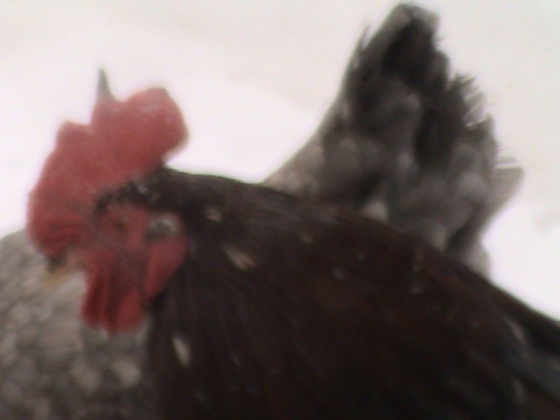 even for my wide big feet! LOVE THE HOUSE CHICKS!Well it's raining and our driveway and yard are ice skating rinks with at least and inch of water and growing. The Chickens loved it till it started to rain, and the boys (ducks) were in heaven. They didn't want to go back in the run. Took some pics of my roo, but he was moving so much they didn't come out that well, but this is the best one that I have. I still think that it looks like he's giving the bird.