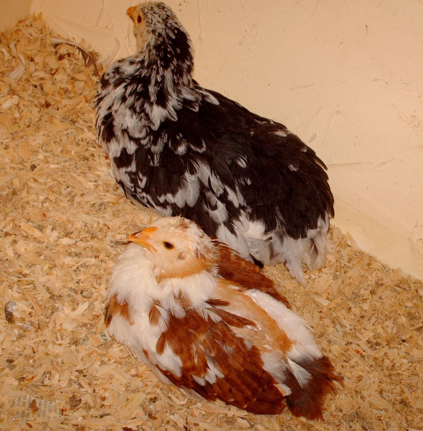 o I forgot to label. This little one is a Russian Orloff and the big black and white is a much older Mottled Java Pullet. That little Orloff pullet is very sweet she always snuggles up to the Java and the Java mother all the chicks already.
