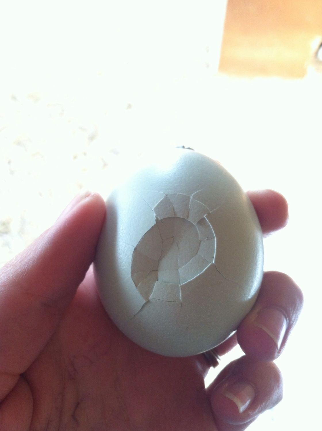 I had the egg laying flat and took the picture down. It might have had an angle but not to much. My coop was a mad house this am... Someone told me they had taped an egg like that before so that's what I did. I don't really need more mix baby's but the broody decided to sit on eggs while I was away and DH didn't collect the eggs lol. But I don't think I can just toss it. So we will see.... I tried moving her before and it didn't work. But I tried again today and after a long time puting her in a big dog crate and covering her so it was dark only then did she decide to sit back on the eggs. During some time this am my EE roo dropped another egg in her nest so I am candeling tonight.