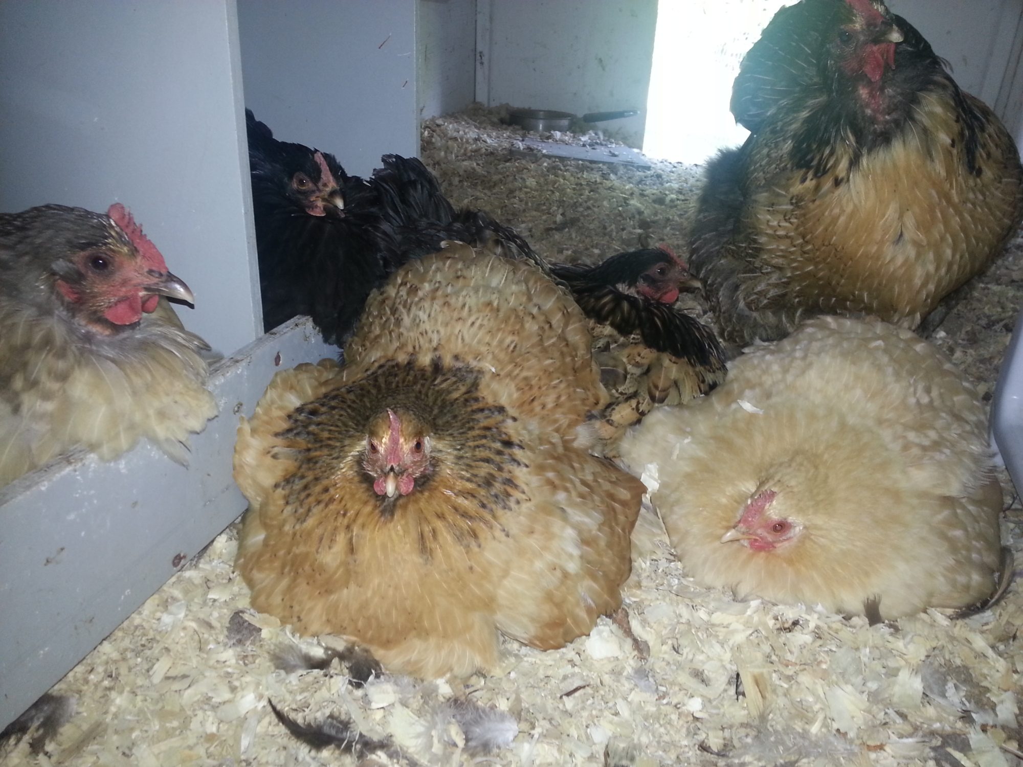 3 silkies, 2 Orps, 3 LF frizzle Cochins, and 1 duckling!