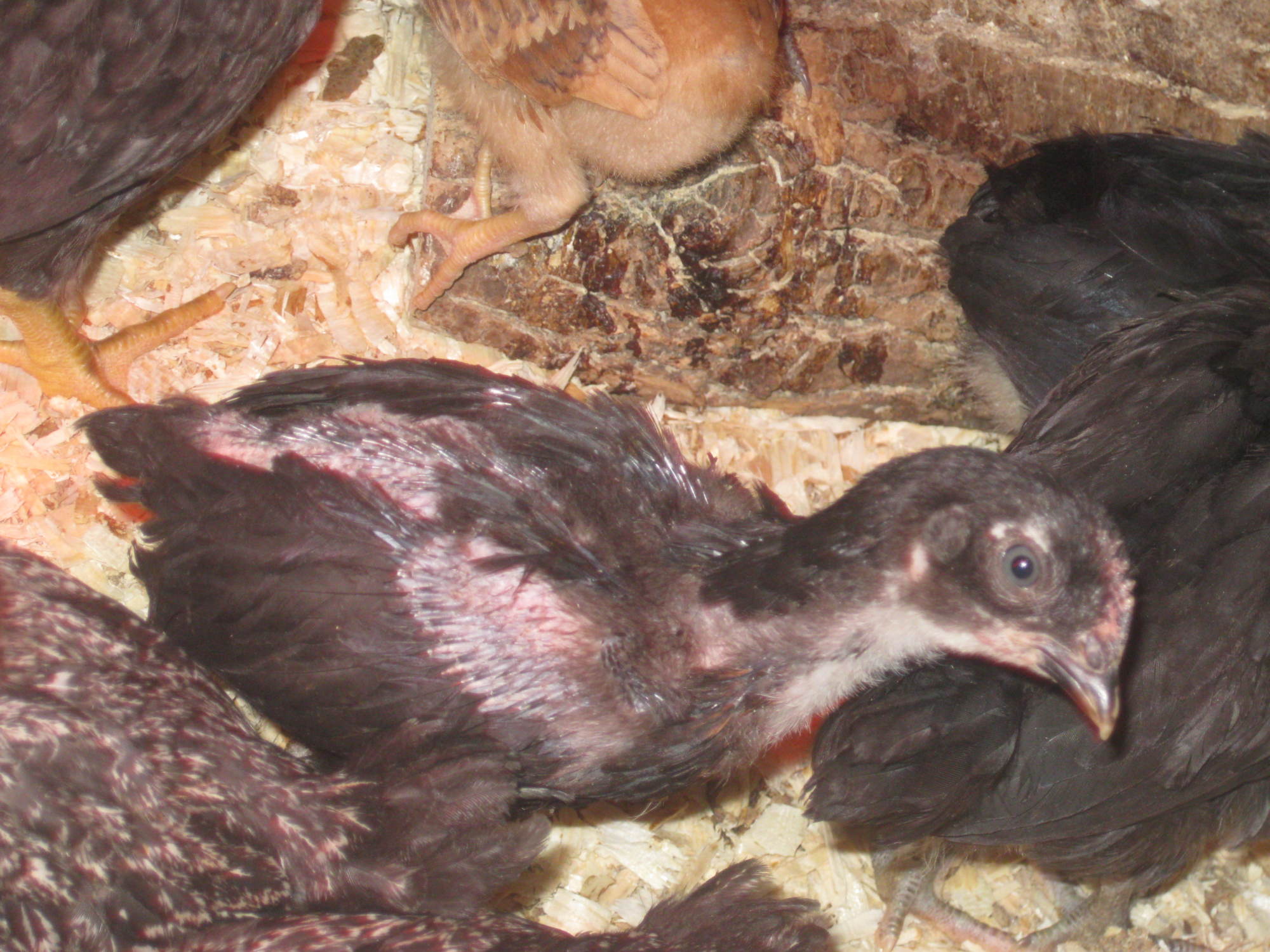 Some of my chicks hatched (almost a month ago) with some patches of down missing.  I figured it was from the hatch and they'd fluff up fine.  Well they fluffed up, but the patches remained.  On one or two, pretty much the entire back is naked.