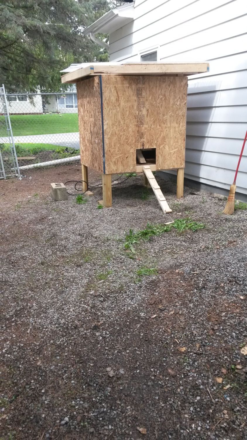 Here's the coop when it was first built. Right now food and water are kept underneath that left side. What I was thinking of is nailing boards to three sides and leaving the side where the ramp is open so they can hop down and go underneath, but still have some shelter. We are planning to keep a good portion of the fenced in area shoveled out for them all winter.