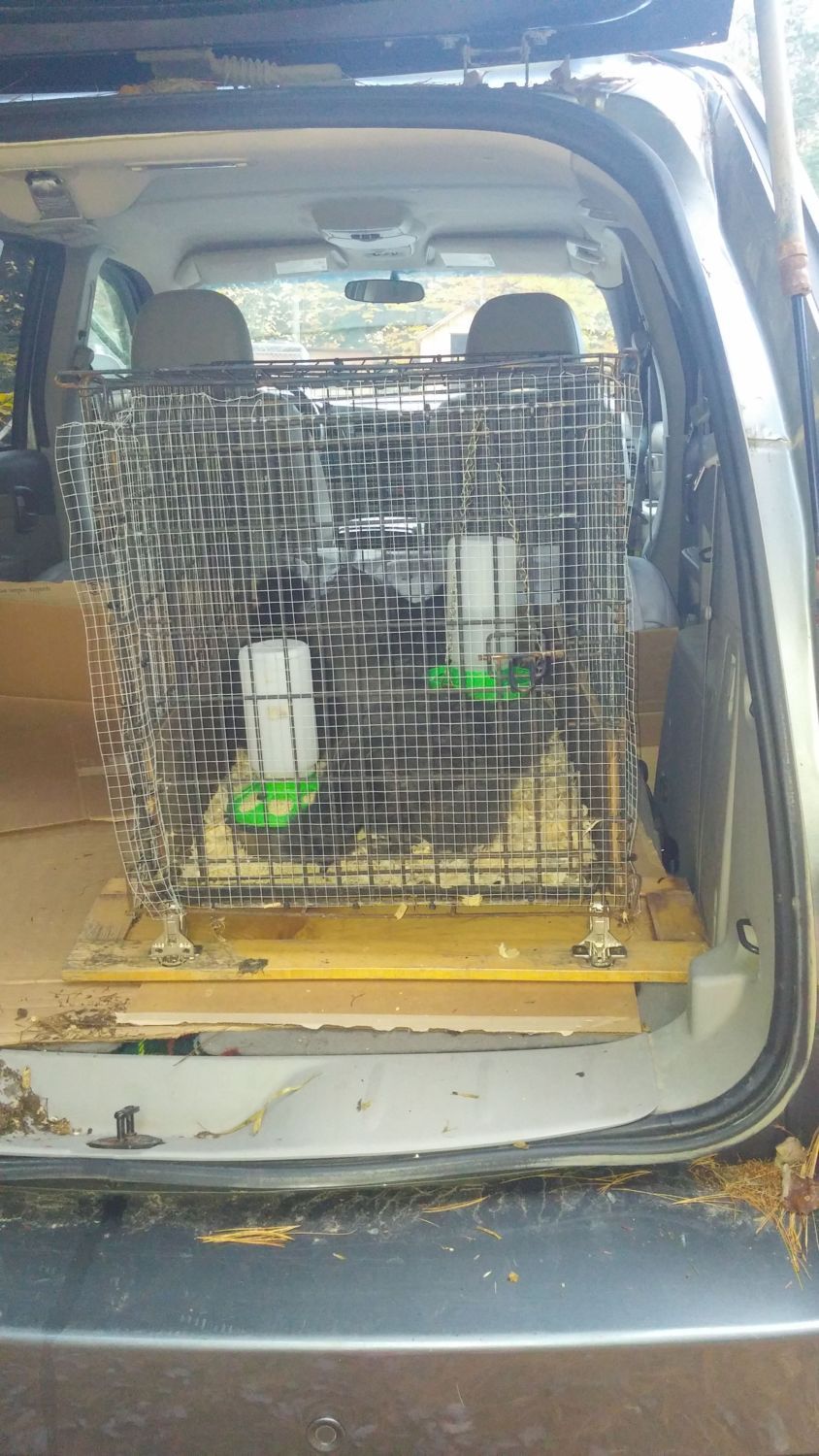 Well here's my temporary staching place. Im sure my husband will understand...unless they poop on his leather seats, but a girls got to protect her flocks!